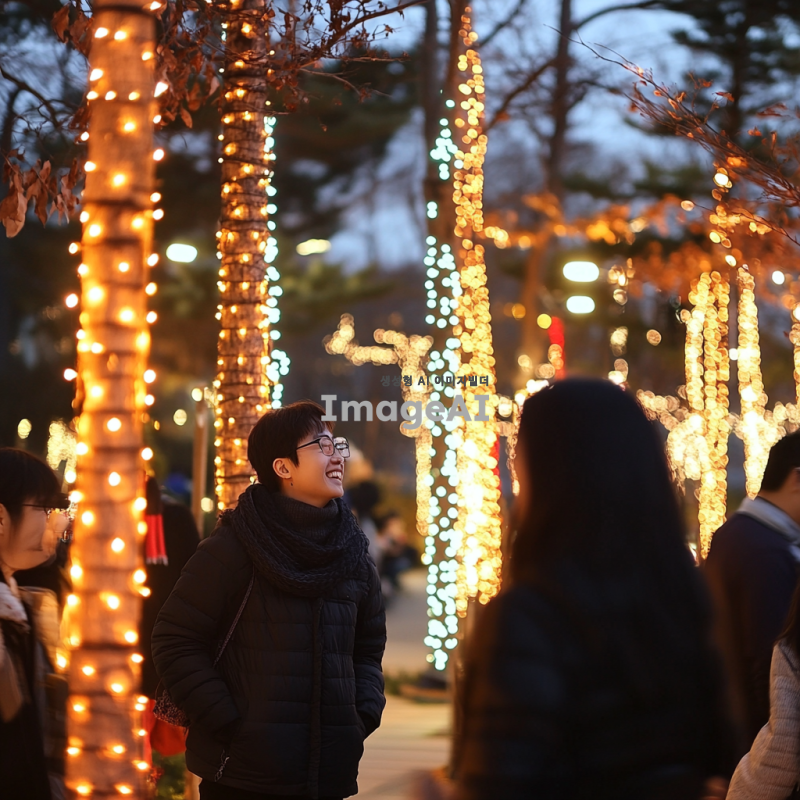 크리스마스 조명이 반짝이는 공원에서 여러 명의 한국인들이 행복하게 웃고 있는 모습. 따뜻한 겨울 분위기 속에서 소중한 순간을 즐기고 있는 사람들, 화려한 조명과 아름다운 나무가 어우러진 풍경. 가족과 친구들이 함께하는 즐거운 크리스마스의 모습.