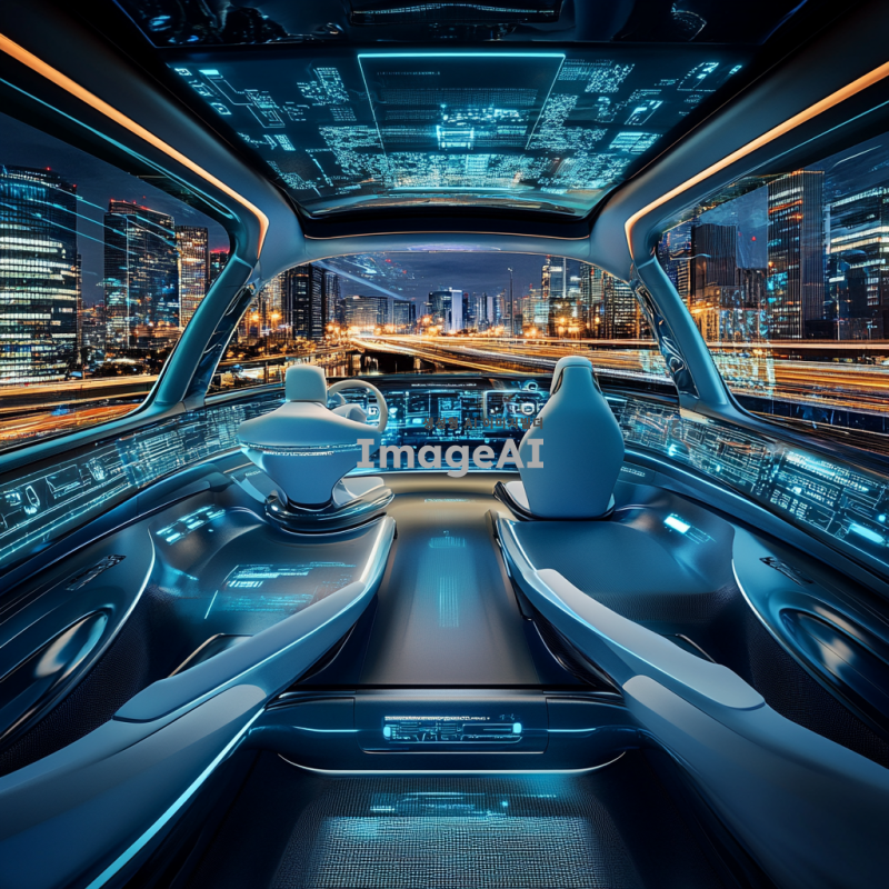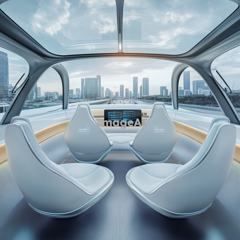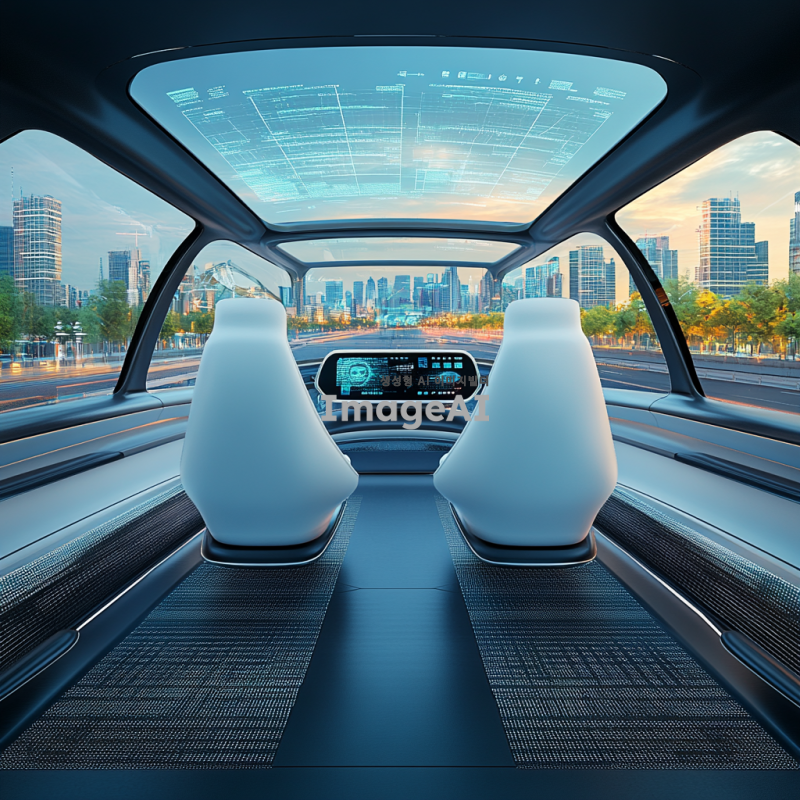 자율주행 자동차가 상용화된 미래의 모습, 운전자의 손이 자유로워진 상황에서 혁신적인 기능과 디자인을 갖춘 자동차 내부. 넓고 편안한 공간, 다양한 디지털 인터페이스와 터치스크린, 자동으로 조정되는 좌석과 조명, 운전자가 아닌 승객들이 편안하게 대화를 나누고 있는 모습. 창밖으로 보이는 미래 도시의 풍경과 함께, 자동차 외부는 매끄럽고 현대적인 디자인으로, 전기차의 특징을 살린 환경 친화적인 요소가 강조된 모습.