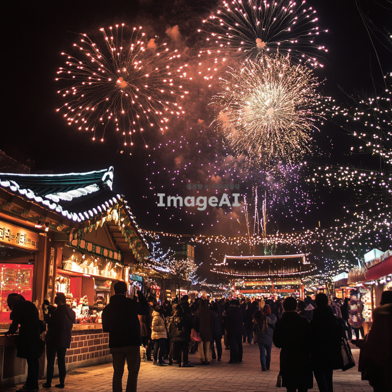 화려한 불꽃놀이 모양의 조명이 밤하늘을 밝히고 있는 장면, 다양한 색상의 불꽃이 터지는 모습, 따뜻한 분위기와 축제의 느낌이 가득한 배경, 한국의 전통 명절을 기념하는 행사, 사람들의 즐거운 표정과 함께 조명 효과가 돋보이는 이미지.