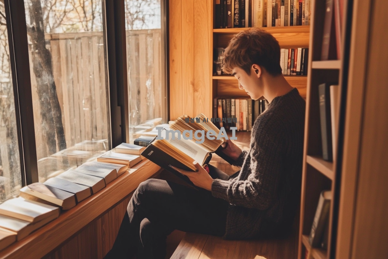 김민호라는 이름을 가진 한국 남성이 도심의 카페에서 책을 읽고 있는 모습, 따뜻한 햇살이 들어오는 창가에 앉아 있으며, 편안한 옷차림과 집중하는 표정, 주변에는 다양한 책들이 놓여 있고, 카페의 아늑한 분위기를 강조해 주세요.