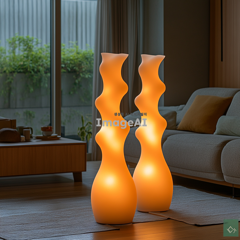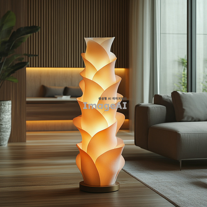 아스파라거스 모양의 독특한 조명 디자인, 자연적인 색감과 질감을 강조하며, 현대적인 인테리어에 잘 어울리는 스타일. 아스파라거스의 줄기와 잎을 형상화한 조명, 부드러운 빛이 방 안을 따뜻하게 밝히는 모습. 배경은 아늑한 거실 공간으로 설정하고, 조명이 중심에 배치된 장면.