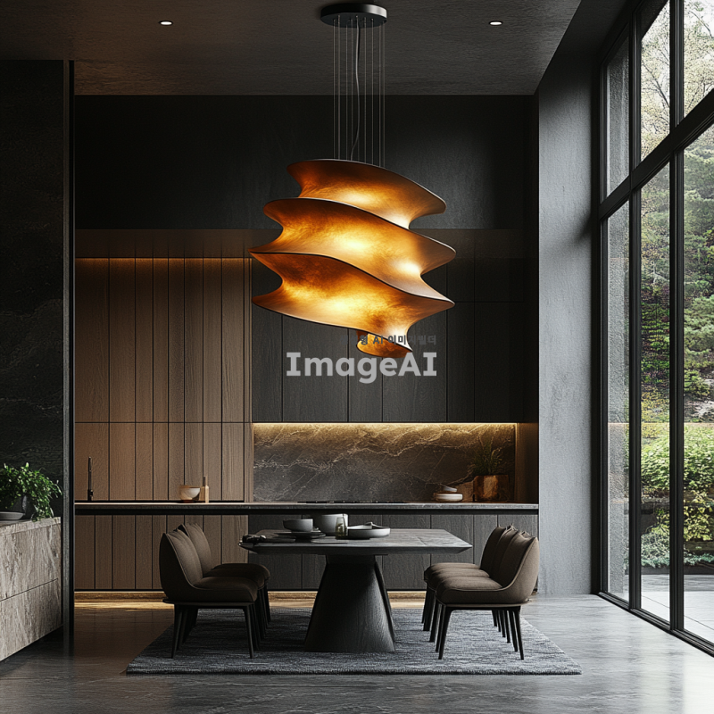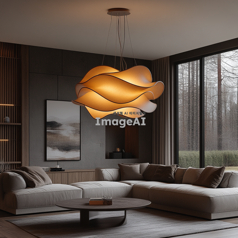현대적이고 세련된 디자인의 조명을 중심으로 한 이미지, 매끄러운 곡선과 기하학적 형태를 가진 조명 기구, 고급스러운 소재와 다양한 색상의 조명 효과, 세련된 인테리어와 조화를 이루는 모습, 따뜻하고 아늑한 분위기를 연출하는 조명, 현대적인 공간에 어울리는 스타일리시한 디자인.