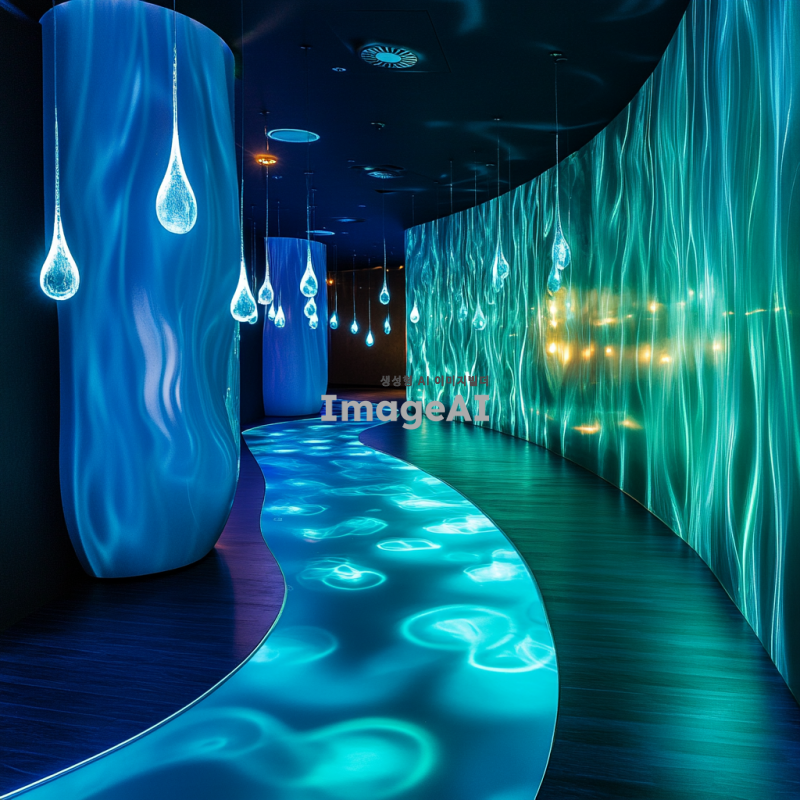 물방울 모양의 불빛이 켜져 있는 방, 방 안은 수중을 연상시키는 파란색과 초록색의 조명으로 가득 차 있으며, 벽에는 물결 무늬가 흐르고, 바닥에는 잔잔한 물결이 있는 듯한 느낌을 주는 모습, 조명에서 나오는 따뜻한 빛이 방 안을 부드럽게 감싸고 있는 장면.