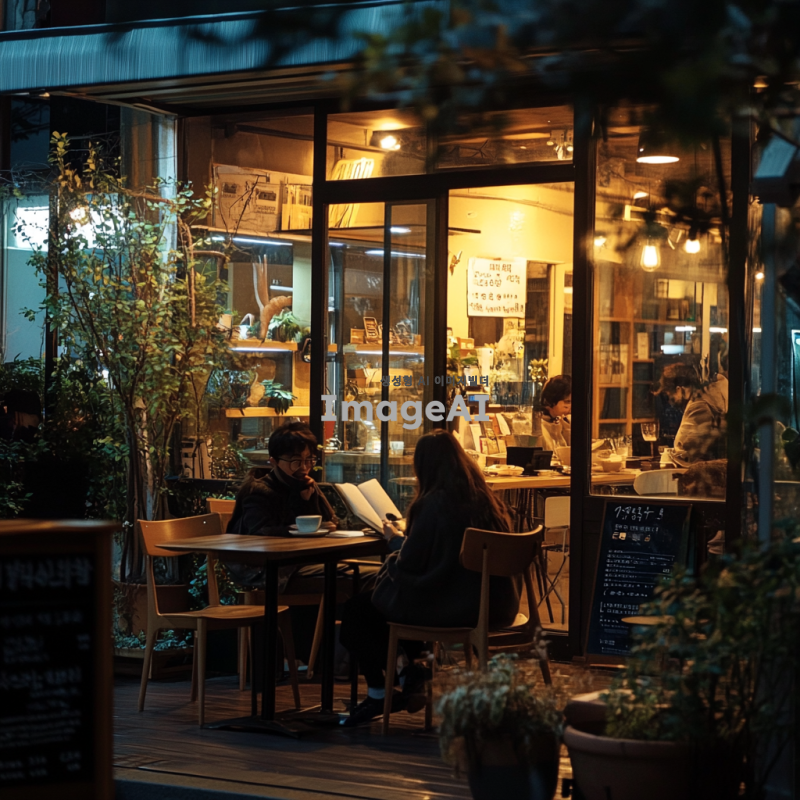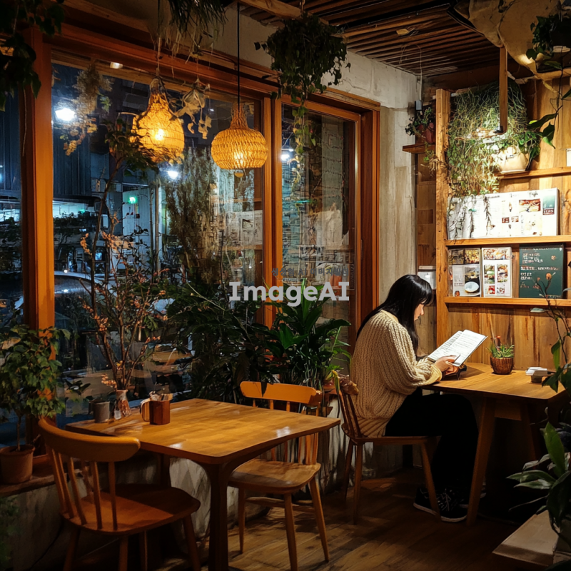 따뜻한 조명이 비추는 아늑한 카페 내부, 나무 테이블과 의자, 창가에 놓인 화분, 부드러운 색감의 인테리어, 한국인 손님이 차를 마시며 책을 읽고 있는 모습, 저녁 시간의 편안한 분위기.