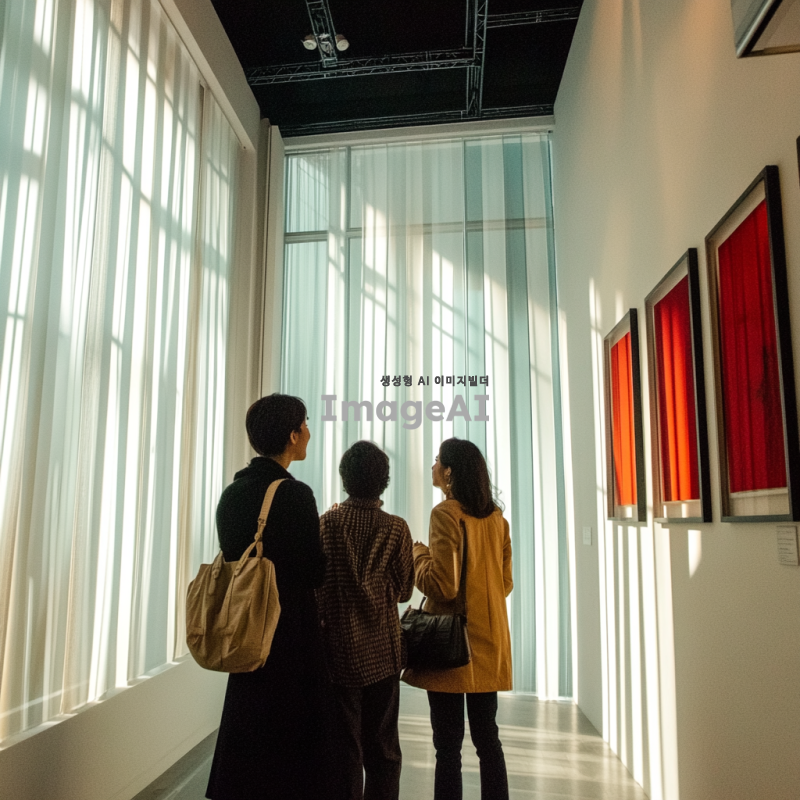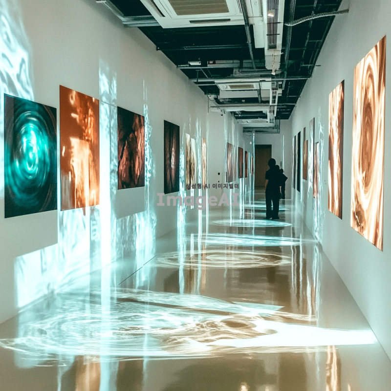 부드러운 조명이 비치는 현대적인 갤러리 공간, 다양한 색상의 조명 효과가 어우러져 있는 추상적인 예술 작품, 조명에 의해 강조된 텍스처와 형태, 관람객들이 감상하는 모습, 아늑하고 창의적인 분위기, 한국의 전통과 현대가 조화를 이루는 요소들, 예술적이고 영감을 주는 장면.