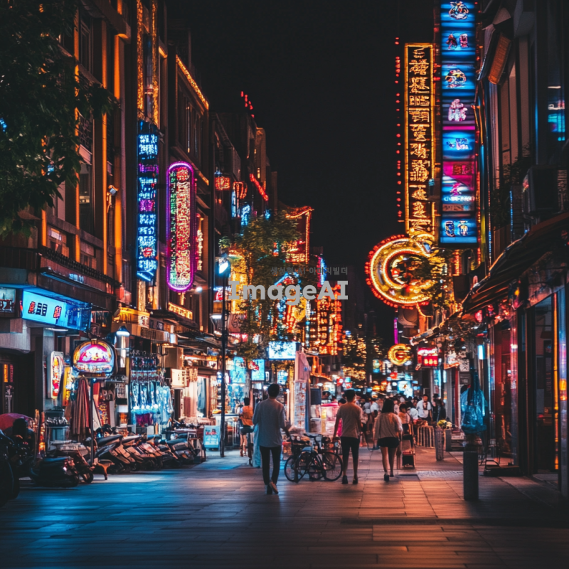 아름답고 환상적인 조명이 가득한 도시의 야경, 다양한 색상의 네온사인과 부드러운 조명들이 어우러진 풍경, 화려한 조명 아래에서 사람들과 함께 즐거운 시간을 보내는 모습, 따뜻한 분위기를 자아내는 조명 효과, 현대적인 건축물과 자연이 조화를 이루는 장면.