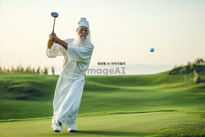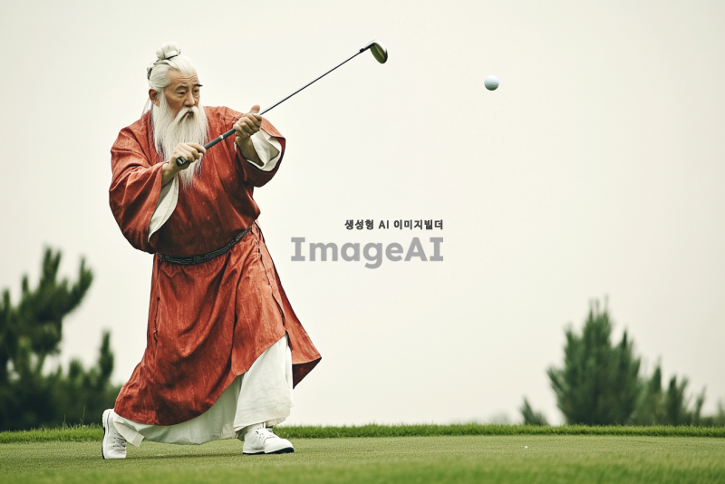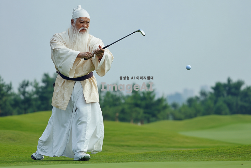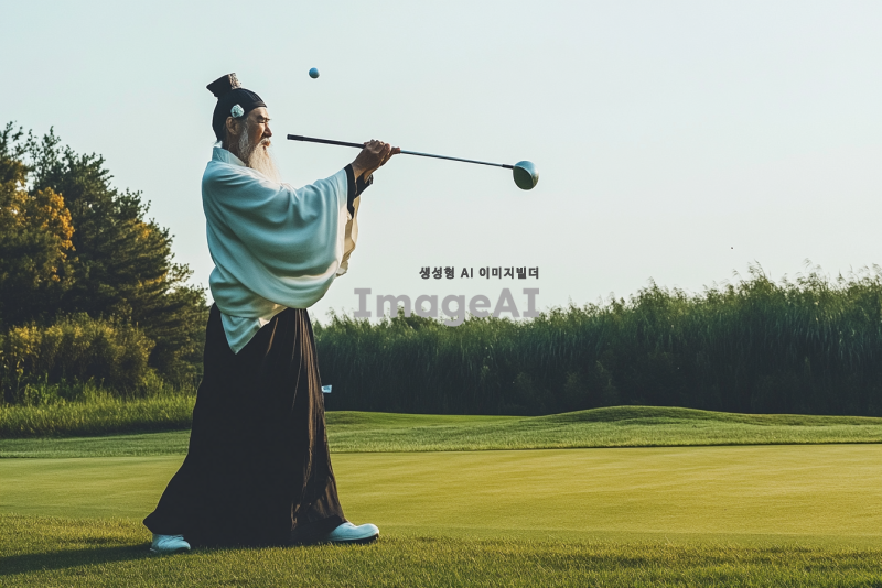 노자가 골프 클럽을 들고 골프 코스에서 스윙하는 모습, 배경에는 푸른 잔디와 맑은 하늘, 전통적인 중국 복장을 입고 있는 모습, 골프공이 공중에 떠 있는 장면, 동양적인 분위기를 강조한 이미지.