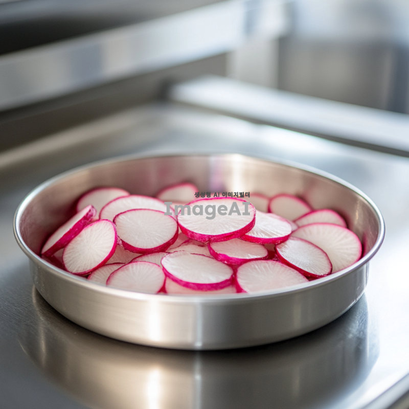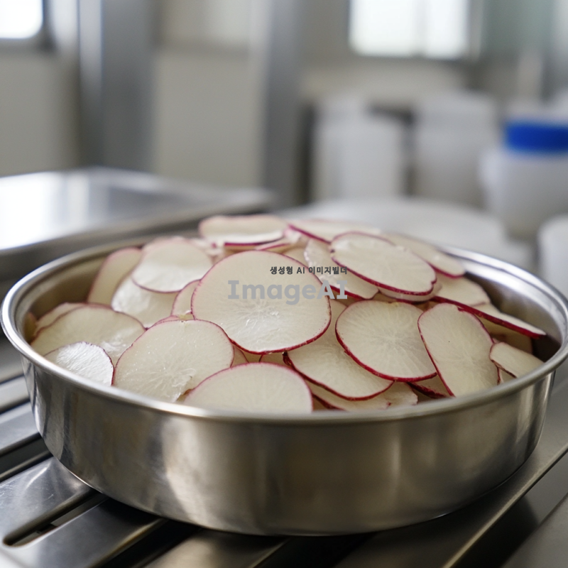 실험실의 동결건조된 스텐볼 안에 여러 개의 채썰어놓은 건조 무우가 담겨 있는 모습. 스텐볼은 금속 재질로 반짝이며, 무우는 생생한 희색을 띠고 있어 신선함이 느껴짐. 배경은 깔끔한 실험실 환경으로, 전체적으로 과학적이고 전문적인 분위기를 강조.
