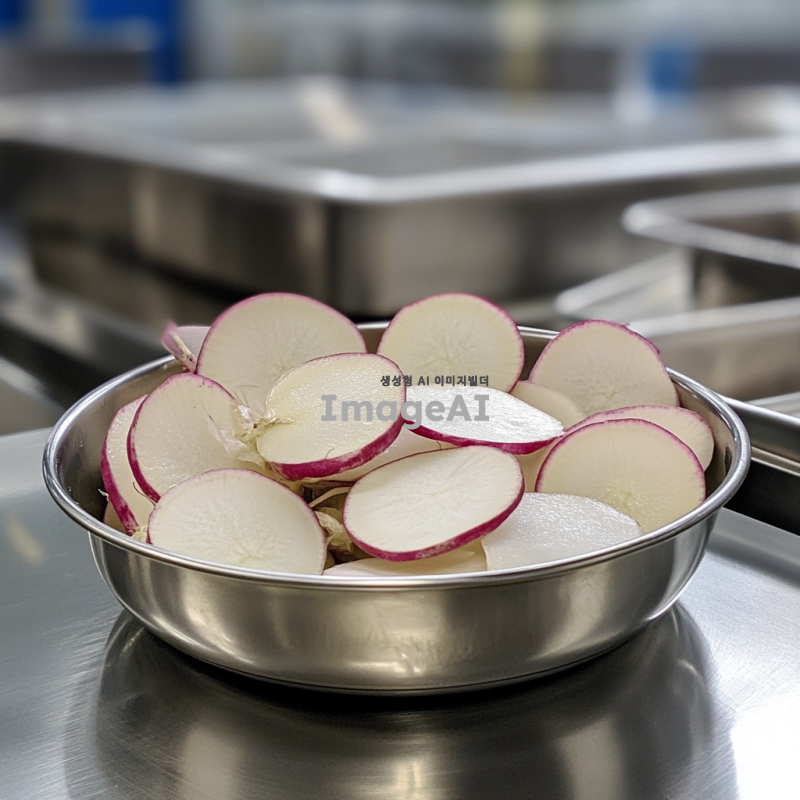 실험실의 동결건조된 스텐볼 안에 여러 개의 채썰어놓은 건조 무우 담겨 있는 모습. 스텐볼은 금속 재질로 반짝이며, 무우는 생생한 희색을 띠고 있어 신선함이 느껴짐. 배경은 실험실의 깔끔한 환경을 보여주며, 전체적으로 과학적이고 전문적인 분위기를 강조.