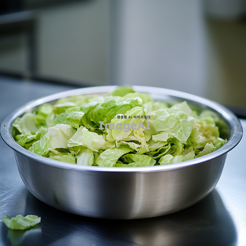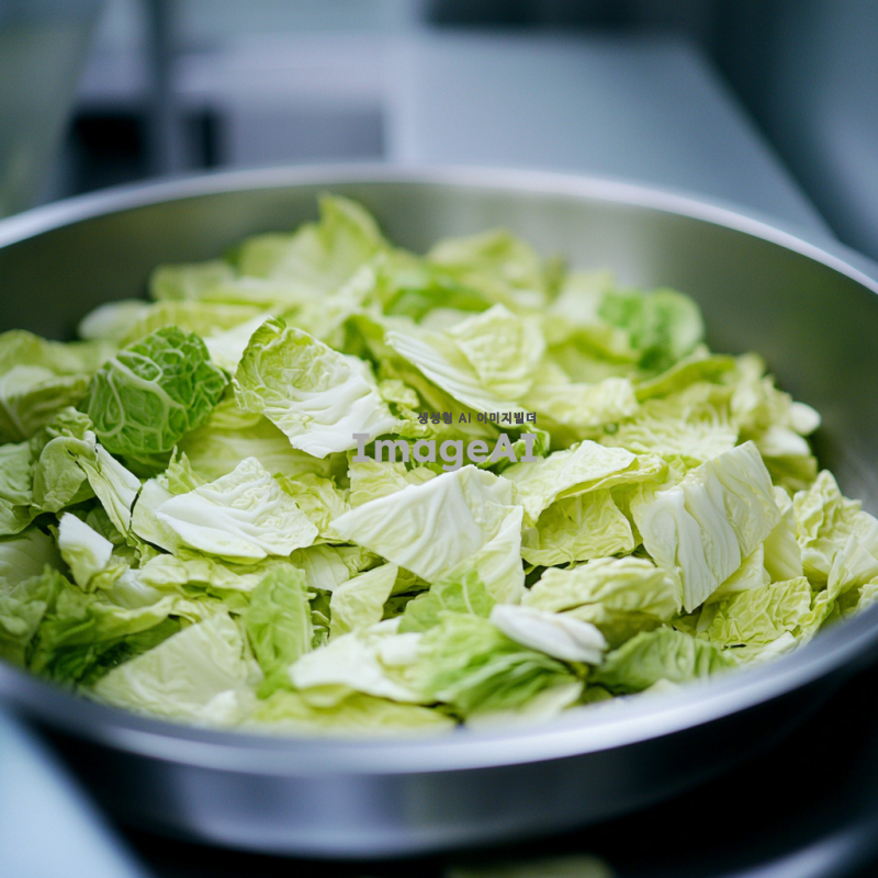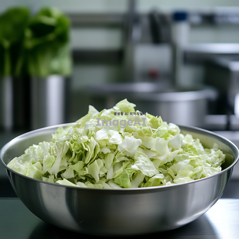 실험실의 스텐볼 안에 볶아서 동결건조한 썰어놓은 배추잎이 담겨 있는 모습, 배경은 깨끗한 실험실 환경, 조명은 부드럽고 자연스러운 느낌, 배추잎의 질감과 색상이 잘 드러나도록 촬영된 이미지