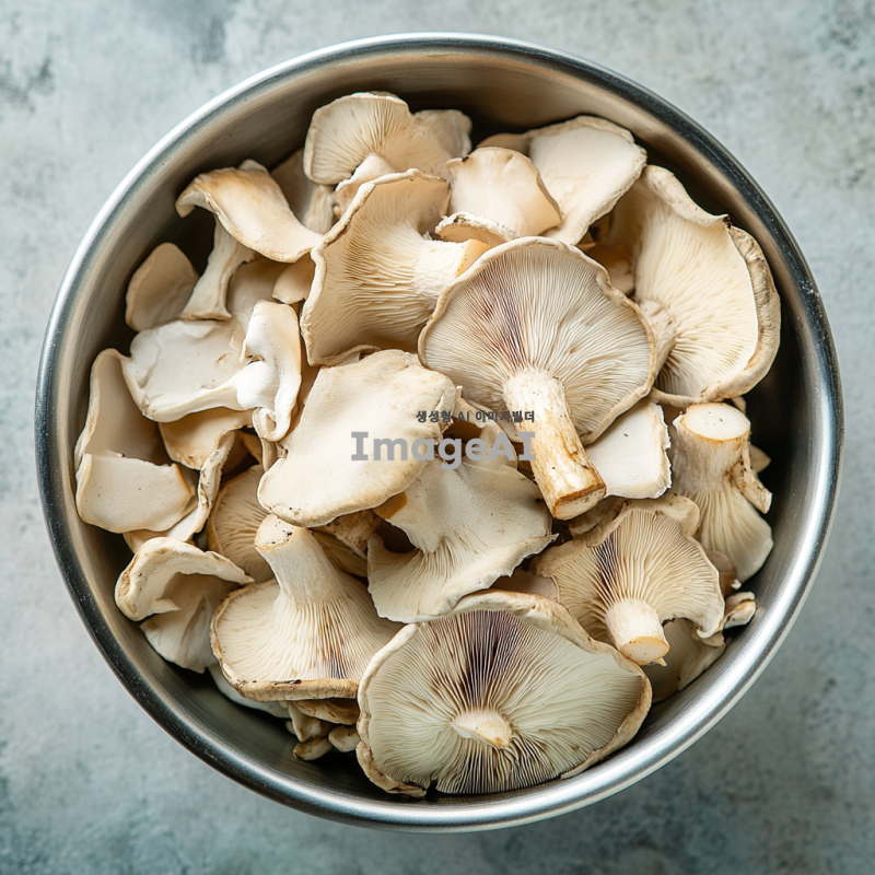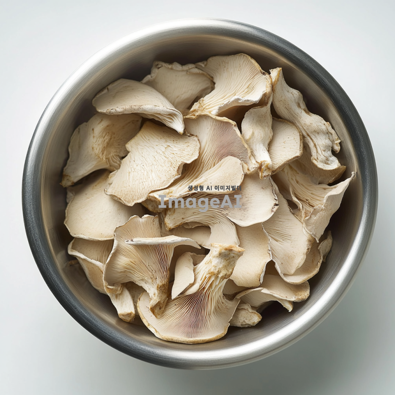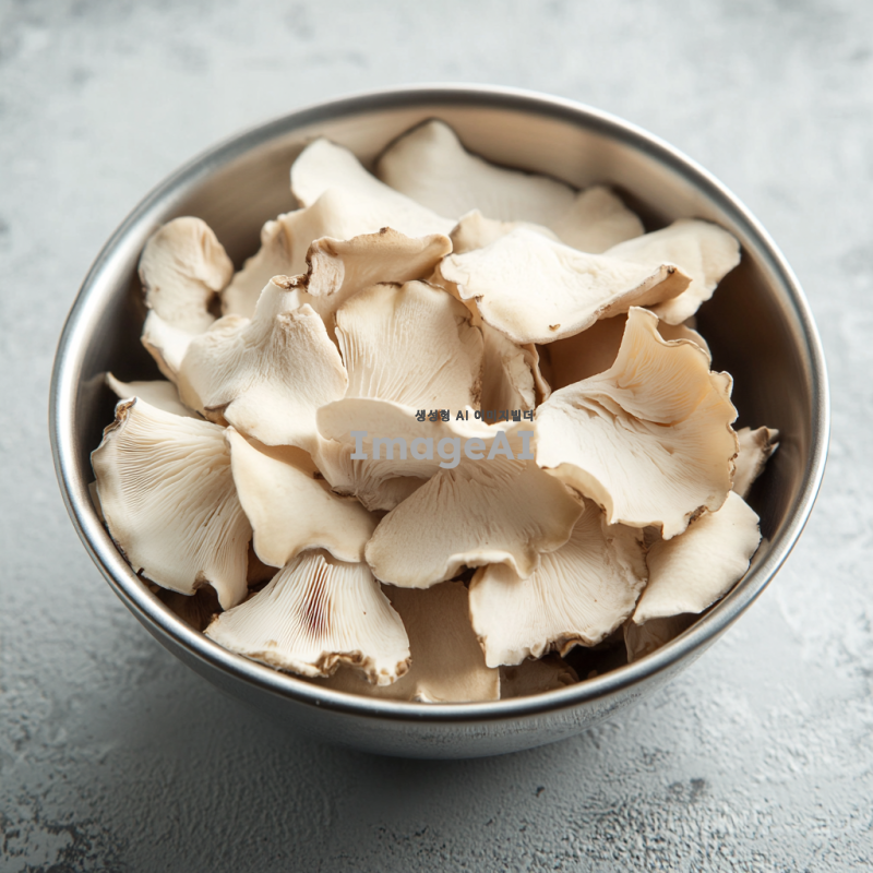 실험실 스텐볼에 담긴 썰어서 동결건조한 느타리버섯, 섬세한 질감과 자연스러운 색감, 깨끗한 배경, 과학적인 느낌 강조, 조명이 부드럽고 자연스러움, 고해상도 이미지