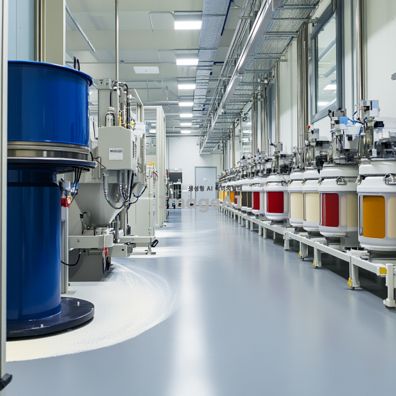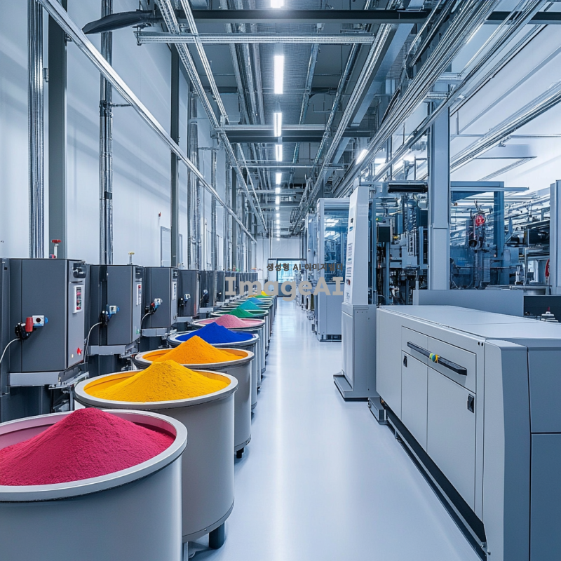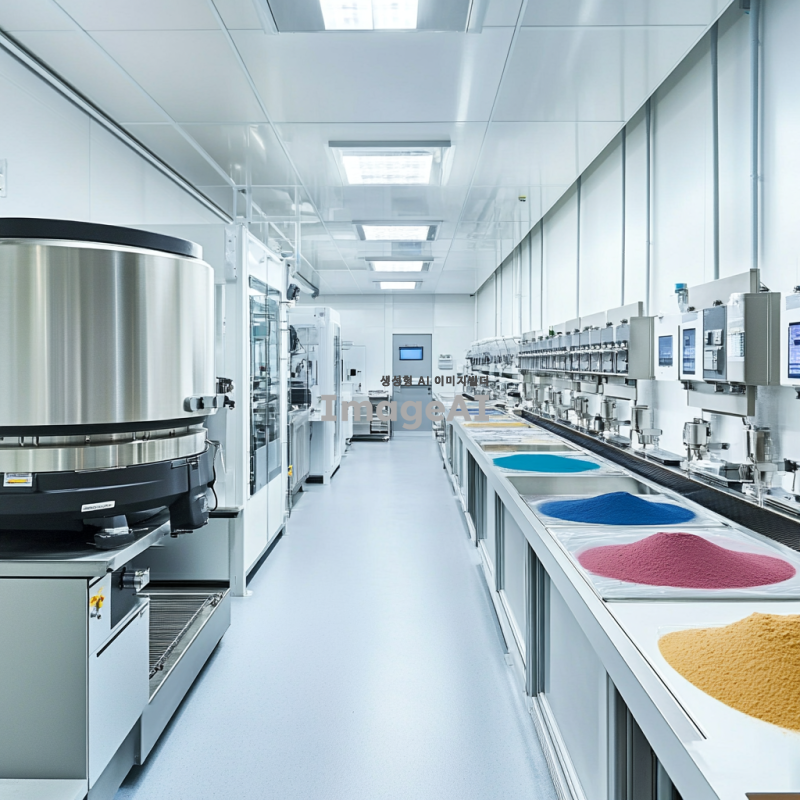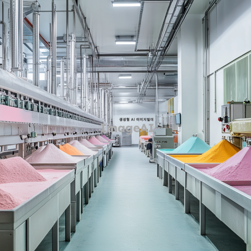 깨끗하고 현대적인 공장 내부, 분말 혼합기에서 다양한 색상의 분말이 혼합되고 있는 모습, 고급스러운 조명 아래에서 작업 중 정돈된 작업 환경, 청결한 기계와 장비, 세밀한 디테일 강조