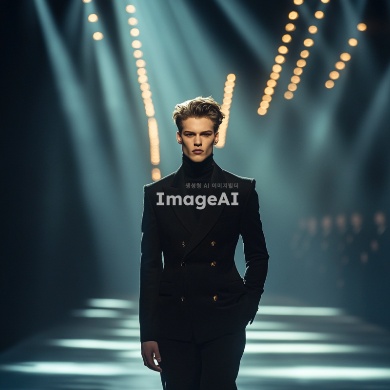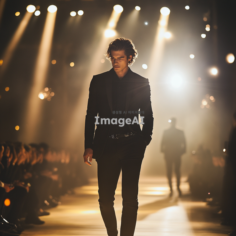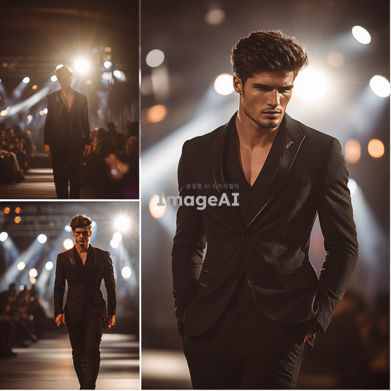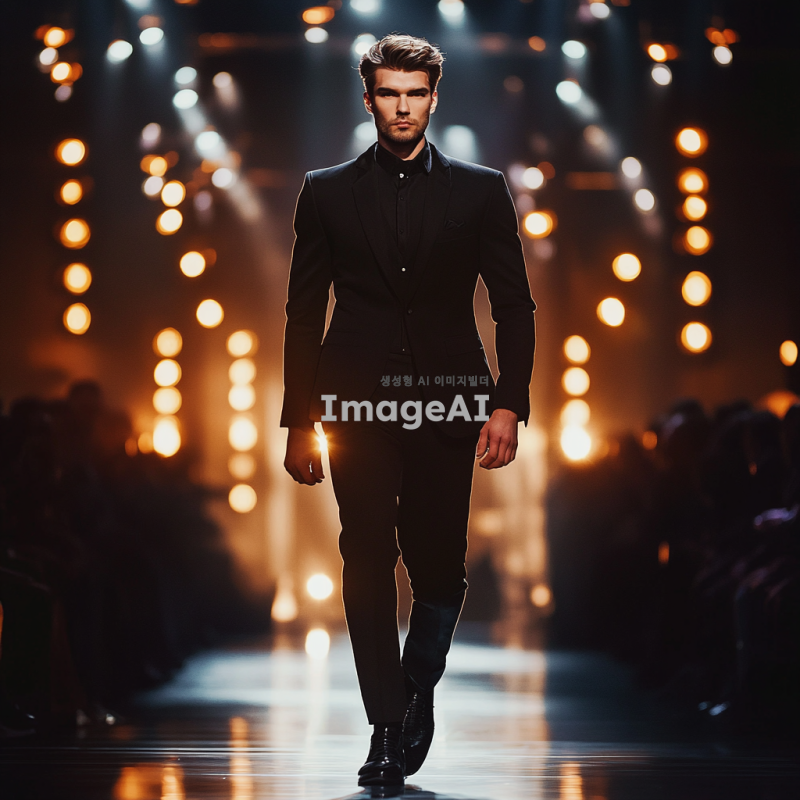 트렌디한 블랙 수트를 입고 런웨이를 걷고 있는 서양 남자 모델, 세련된 헤어스타일과 자신감 넘치는 포즈, 화려한 조명 아래에서의 패션쇼 장면, 고급스러운 분위기와 함께 다양한 각도에서 촬영된 모습, 배경은 패션쇼장.