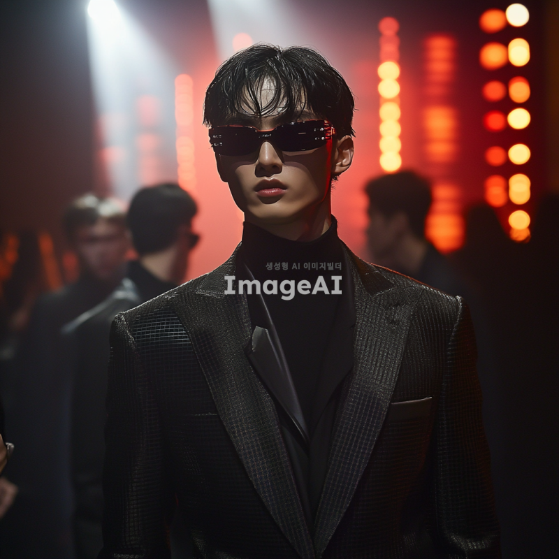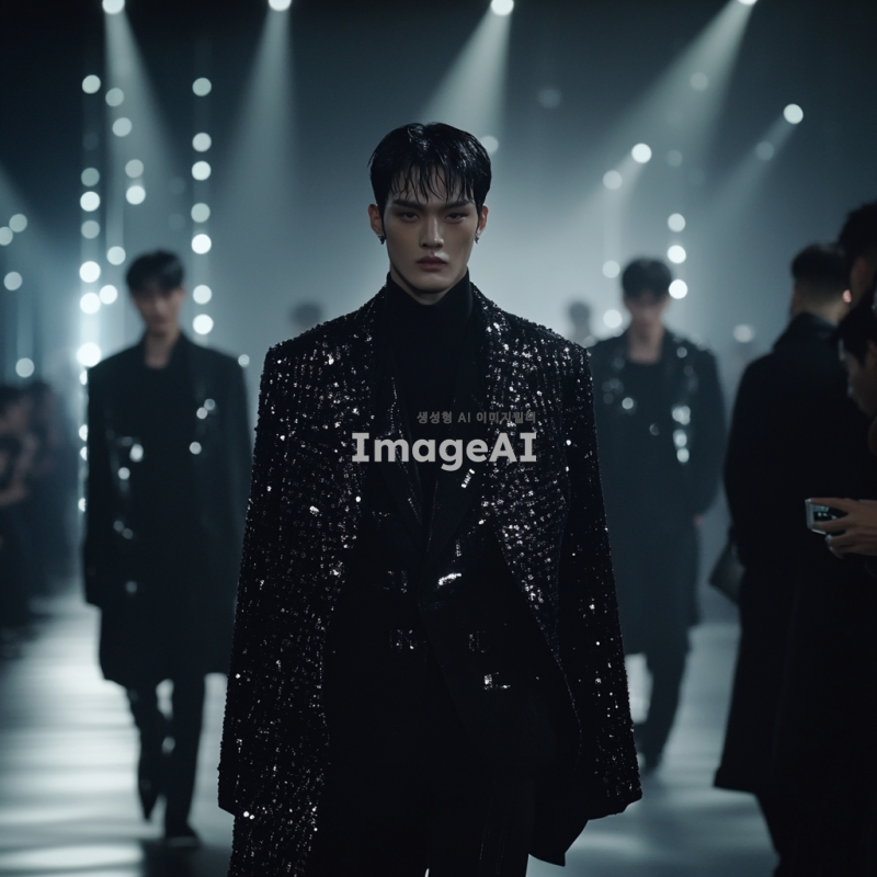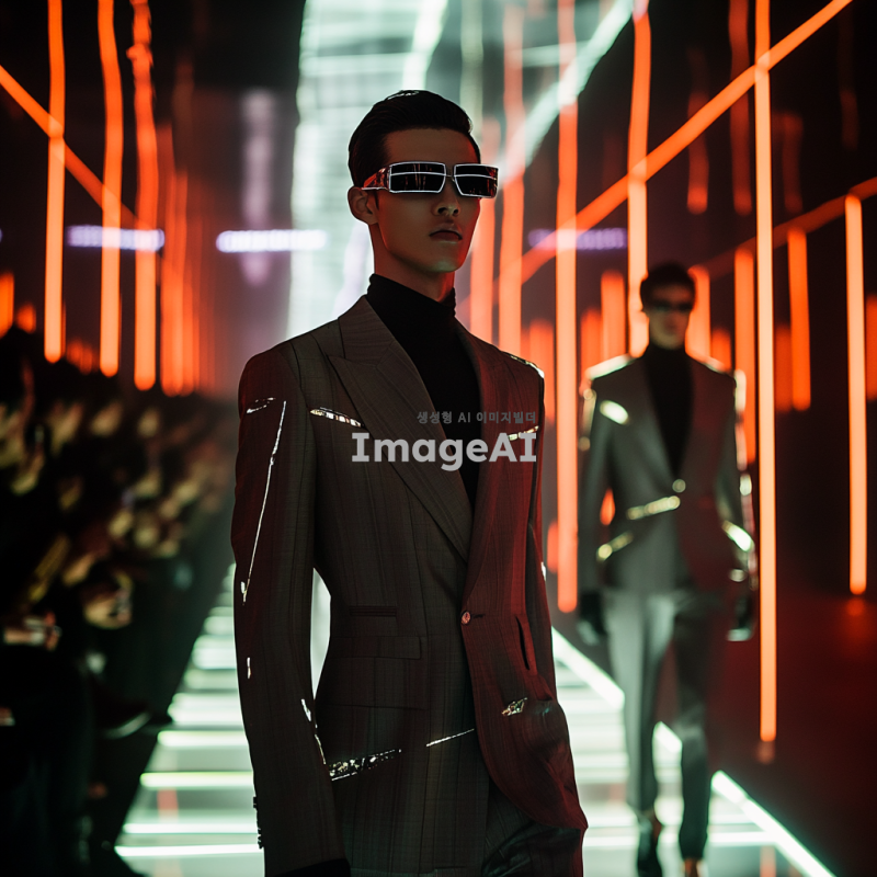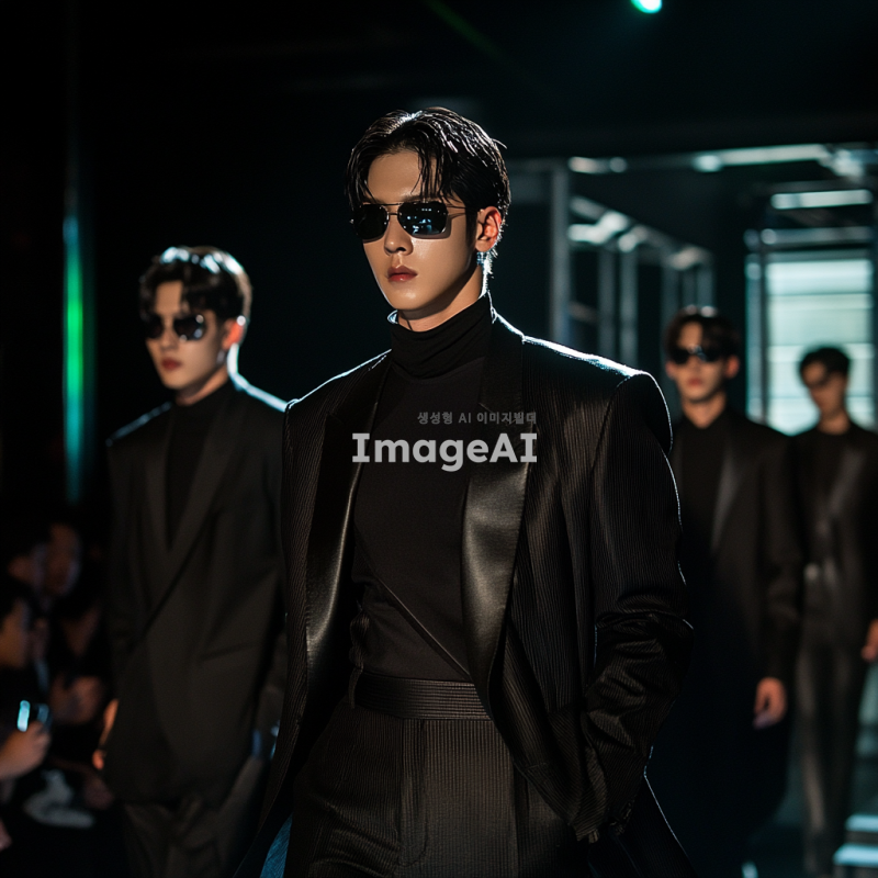 매트릭스 스타일의 수트를 입고 있는 한국 남성 모델들이 런웨이를 걷고 있는 패션쇼 장면. 어두운 조명 아래, 미래적인 분위기의 배경과 함께 세련된 디자인의 수트가 강조되며, 모델들은 자신감 넘치는 포즈를 취하고 있다. 고급스러운 소재와 독특한 액세서리들이 돋보이며, 관객들은 열광적으로 반응하고 있다.