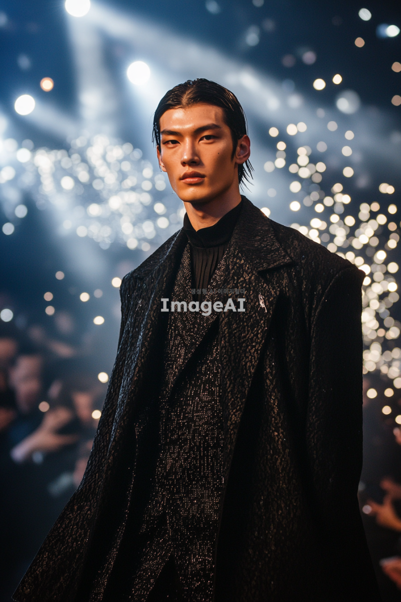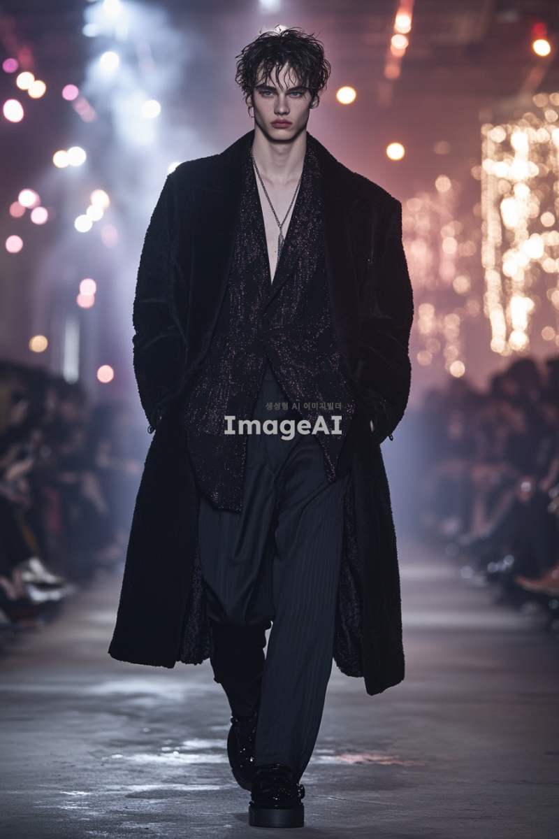 락시크 스타일 수트를 입고 매트릭스 스타일의 검은색 코트를 걸친 남자 모델이 패션쇼장에서 포즈를 취하고 있는 모습. 배경은 화려한 조명과 세련된 관객들로 가득 찬 런웨이로, 모델의 자신감 넘치는 표정과 독특한 스타일이 강조되도록. 전체적인 분위기는 현대적이고 혁신적인 패션의 느낌을 주며, 세밀한 디테일이 잘 드러나도록 구성. 악세사리 많이.