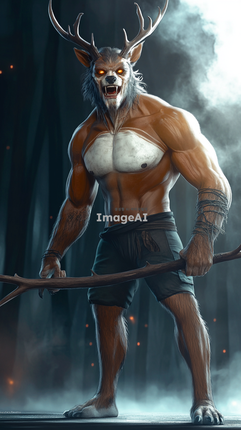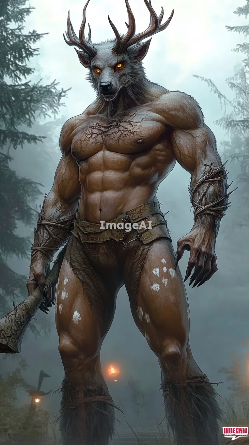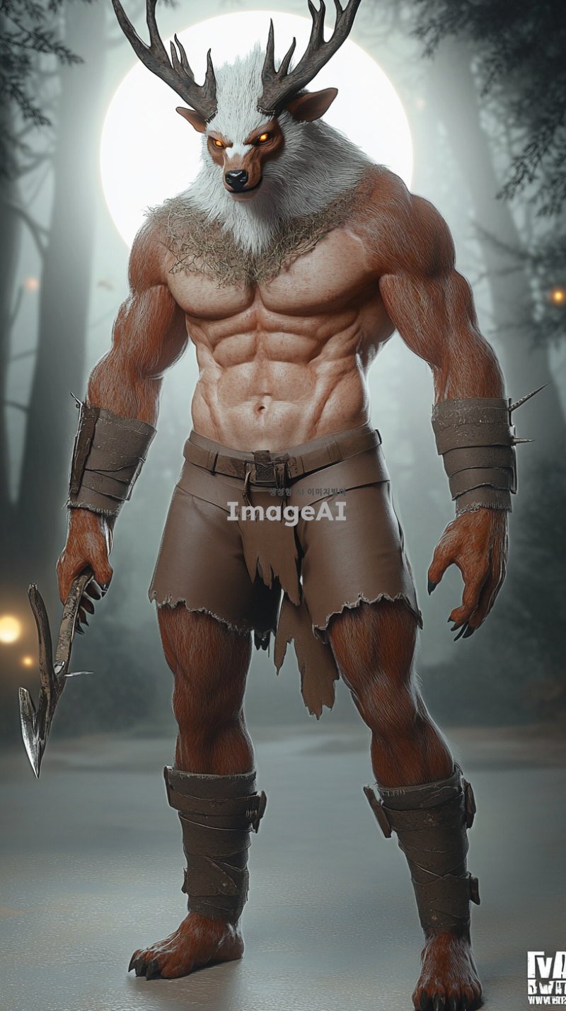 사슴에서 영감을 받은 고도로 사실적인 인간형 캐릭터로, 섬뜩하고 원초적인 우아함을 불러일으키도록 디자인되었습니다. 이 캐릭터는 키가 크고 날씬하며 근육질의 인간형 몸을 가지고 있으며, 매끄럽고 갈색의 털로 덮여 있고, 가슴과 팔다리에는 하얀 반점이 있어 사슴의 자연스러운 외형을 연상시킵니다. 얼굴은 인간과 사슴의 특징이 융합되어 있으며, 크고 빛나는 호박색 눈, 약간 길게 뻗은 주둥이, 그리고 희미한 이끼와 덩굴로 장식된 날카롭고 가지가 뻗은 웅장한 뿔이 돋보입니다. 표정은 차분하면서도 섬뜩한 강렬함을 지니고 있으며, 지혜와 위협이 혼합된 분위기를 발산합니다.