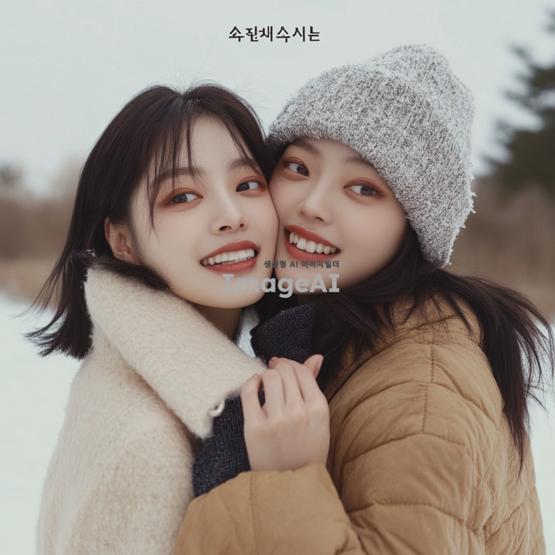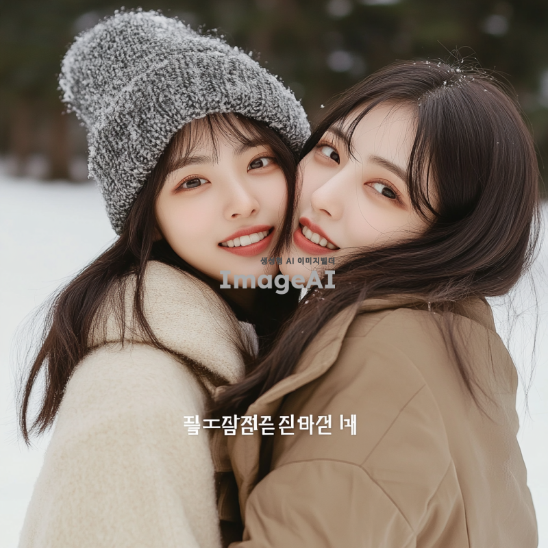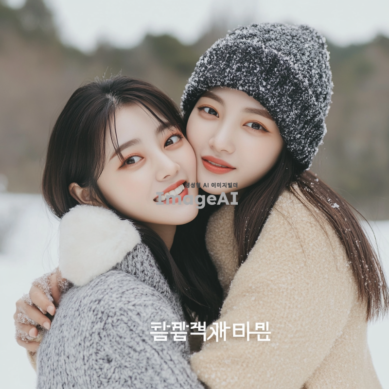 겨울 옷을 입고 자연스럽게 포즈를 취하고 있는 한국인 여성 모델 두 명. 한 모델은 다른 모델을 뒤에서 안고 있으며, 두 사람 모두 환하게 웃고 있는 모습. 배경은 겨울의 따뜻한 분위기를 연출하는 눈 덮인 풍경으로 설정.