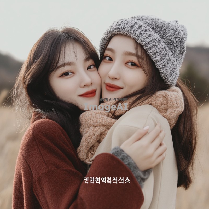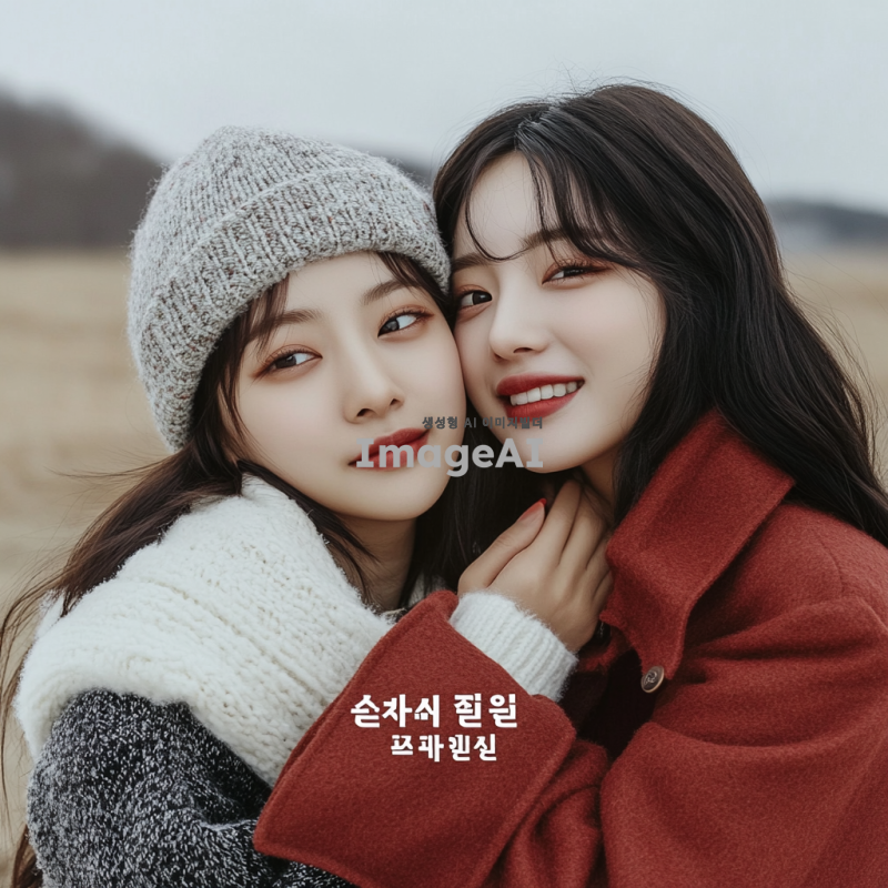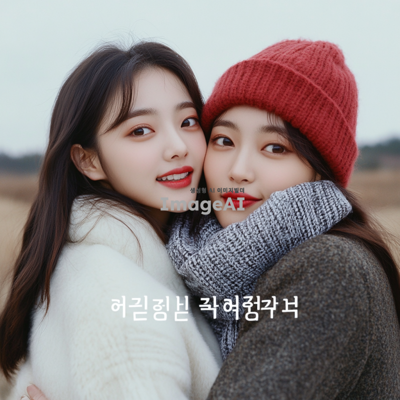 겨울 옷을 입고 자연스럽게 사진을 찍고 있는 한국인 여성 모델 2명. 한 모델은 다른 모델을 뒤에서 안고 있으며, 두 모델 모두 웃고 있는 모습. 배경은 겨울의 따뜻한 느낌을 주는 풍경으로 설정.