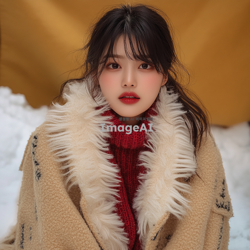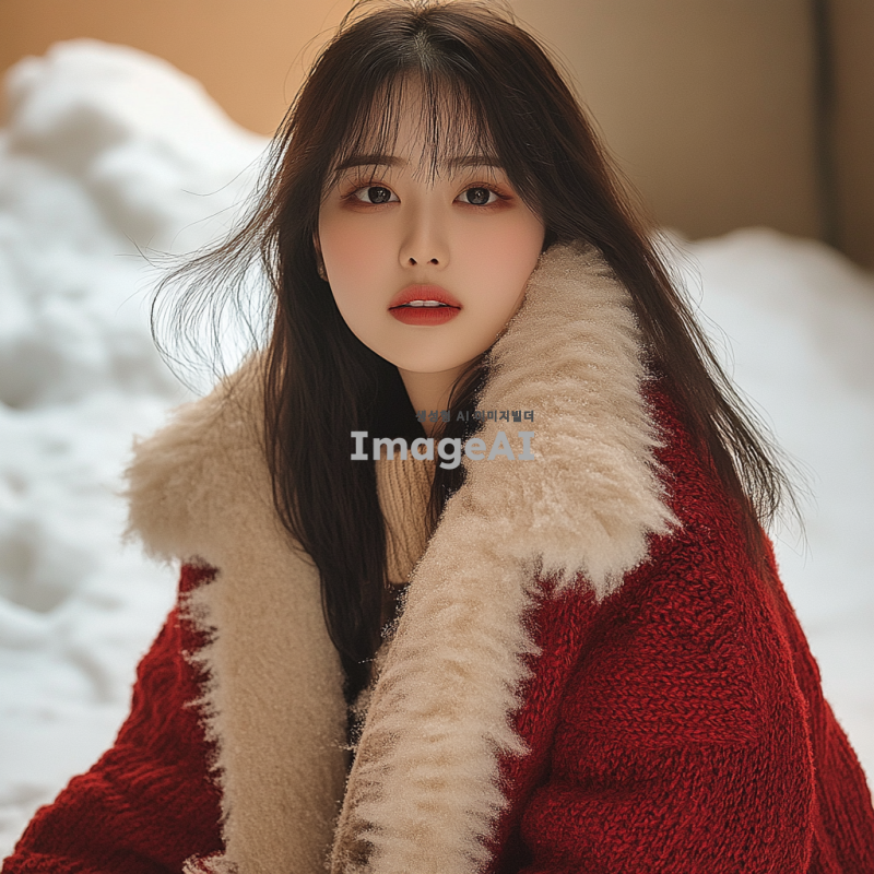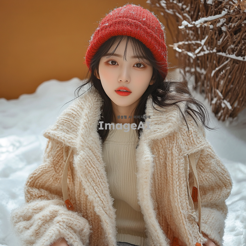 겨울 옷을 입고 자연스럽게 포즈를 취하는 한국인 여성 모델, 부드러운 조명 아래에서 따뜻한 색감의 배경, 눈이 내리는 겨울 풍경 속에서 편안한 표정으로 촬영된 모습, 스타일리시한 겨울 패션 강조, 실내 또는 실외 촬영 가능, 자연스러운 미소와 함께 다양한 각도에서의 포즈