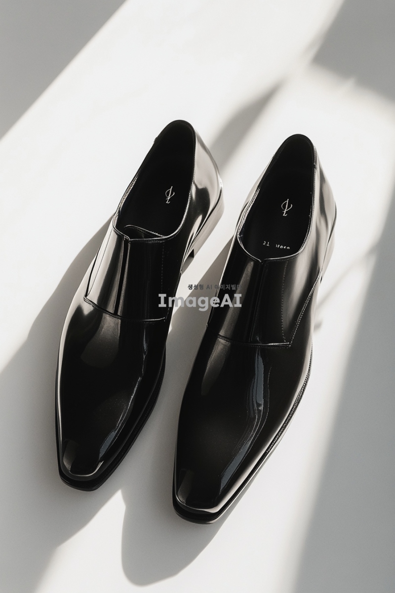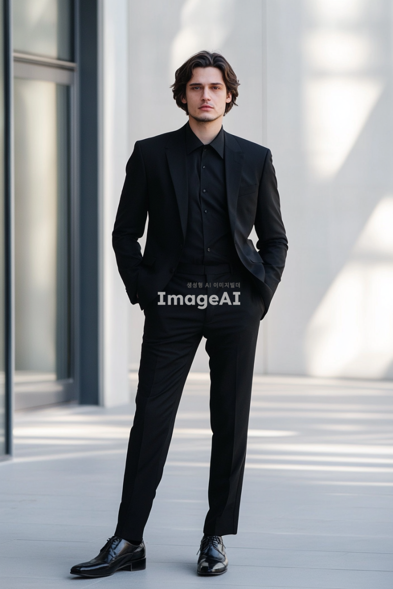 블랙 수트를 입은 현대적인 느낌의 패셔너블한 디자인의 착장 사진, 생로랑 스타일의 구두가 어우러진 모습, 세련되고 고급스러운 분위기, 깔끔한 배경에서 촬영된 이미지.