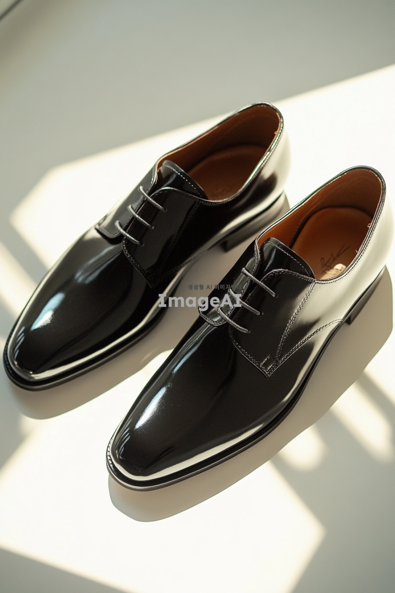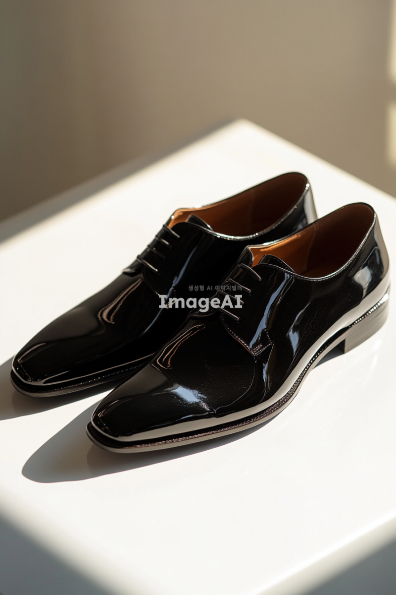 검은색 가죽 구두, 고급스러운 질감과 사치스러운 느낌, 단순한 배경, 실내 촬영, 위에서 내려다보는 시점, 선명한 디테일, 밝은 조명, 순백색 테이블탑, 고화질 사진 스타일. 밝고 어두운 톤 간의 높은 대비, 실내 환경, 조명에 의해 드리워진 부드러운 그림자가 강한 3차원 느낌을 생성합니다. 검은색 광택 재질로, 눈에 띄는 광택이 있으며, 날카로운 모서리를 보여주며 패션 사진 스타일로 표현됩니다. 구두의 디자인은 생로랑과 디올의 시크한 무드입니다.