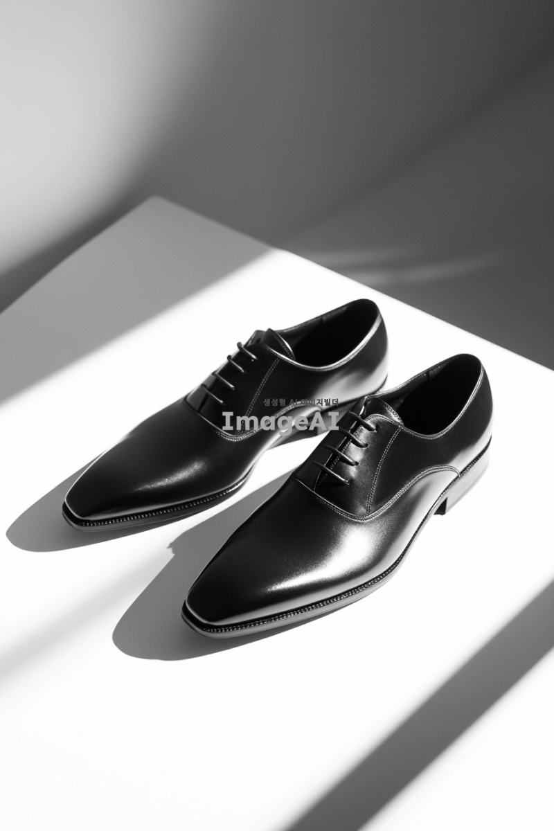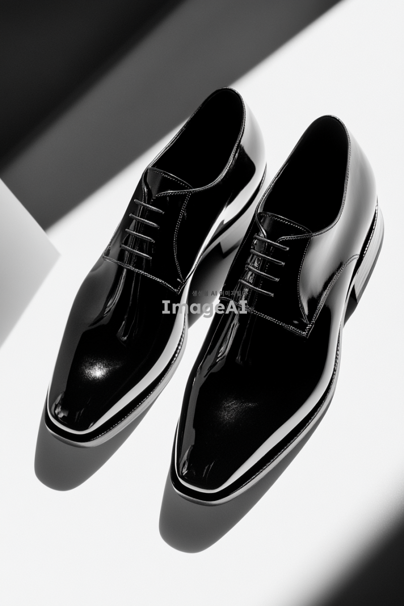 검은색 가죽 구두, 고급스러운 질감과 사치스러운 느낌이 강조된 이미지, 단순한 배경으로 실내에서 촬영된 모습, 위에서 내려다보는 시점에서 선명한 디테일을 담고 있으며 밝은 조명 아래 순백색 테이블탑 위에 놓여 있습니다. 밝고 어두운 톤 간의 높은 대비가 두드러지며, 실내 환경에서 조명에 의해 드리워진 부드러운 그림자가 강한 3차원 느낌을 생성합니다. 검은색 광택 재질로 눈에 띄는 광택을 보여주며 날카로운 모서리의 디자인을 가지고 있습니다. 패션 사진 스타일로, 생로랑과 디올의 시크한 무드를 표현합니다.