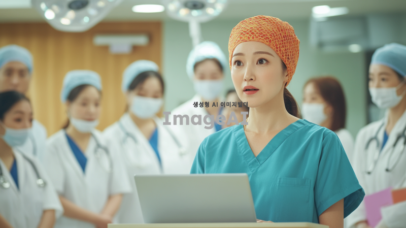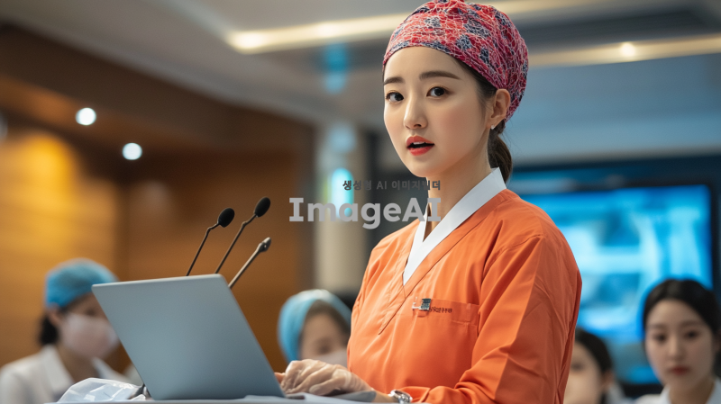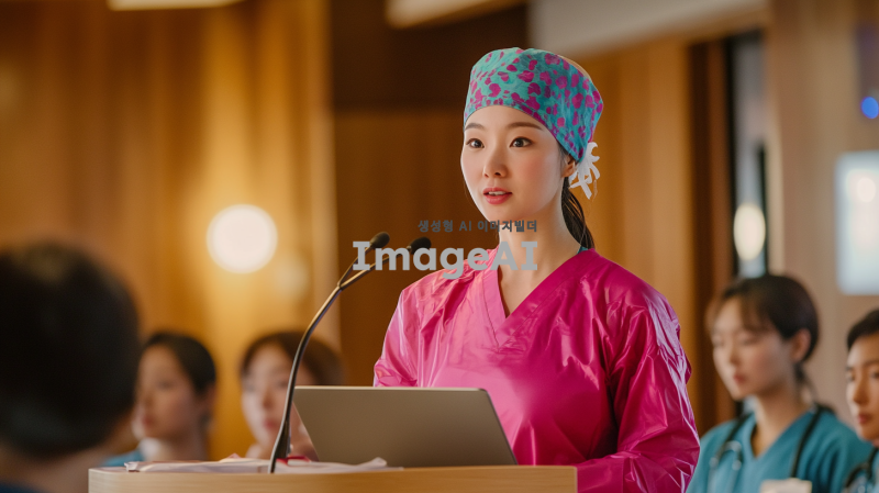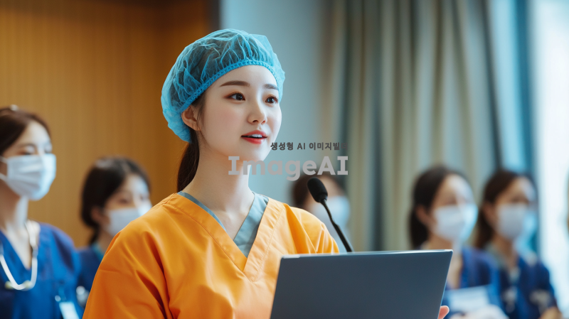 밝은 분위기의 간호모자와 간호망을 착용한 한국인 간호사가 단상에 올라가 회의하는 모습. 간호사는 자신감 있는 표정으로 노트북을 바라보며 발표하고 있고, 주변에는 동료 간호사들과 의료진들이 주의 깊게 경청하고 있는 모습. 배경은 현대적인 병원 회의실로, 따뜻한 조명과 함께 의료 관련 자료들이 배치되어 있어 전문적인 분위기를 강조하고 있다.