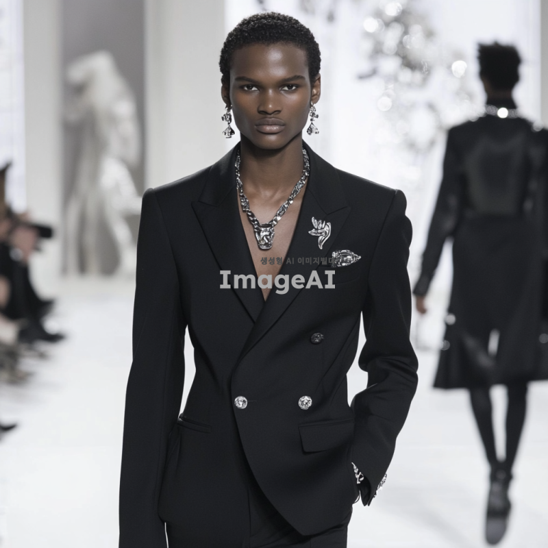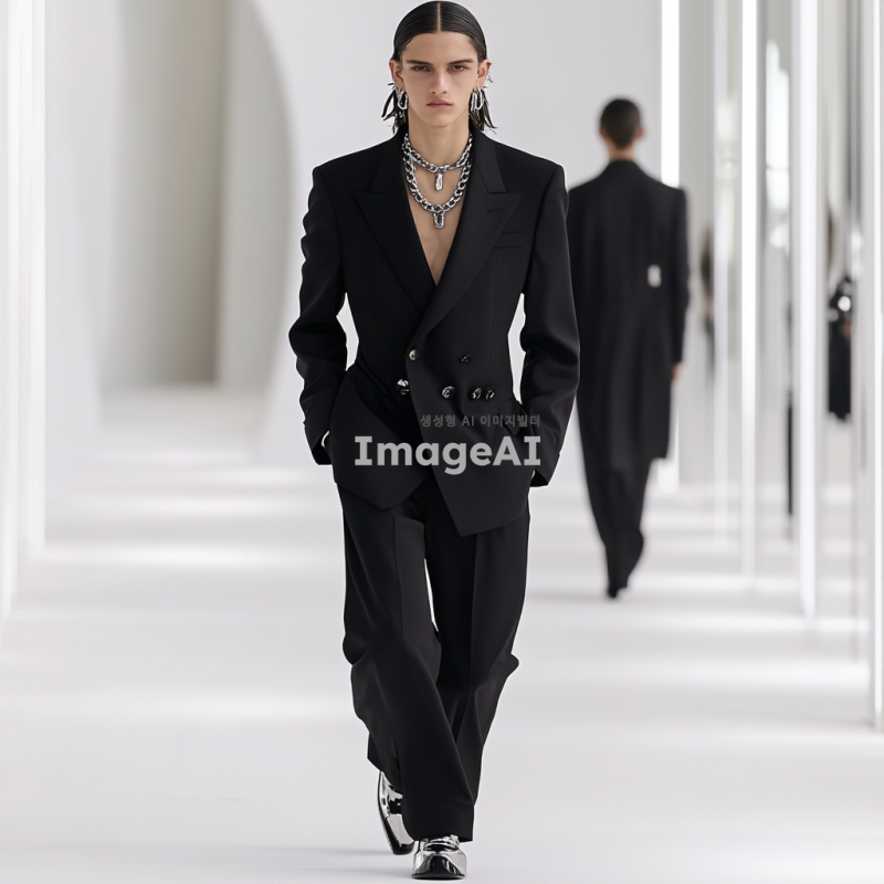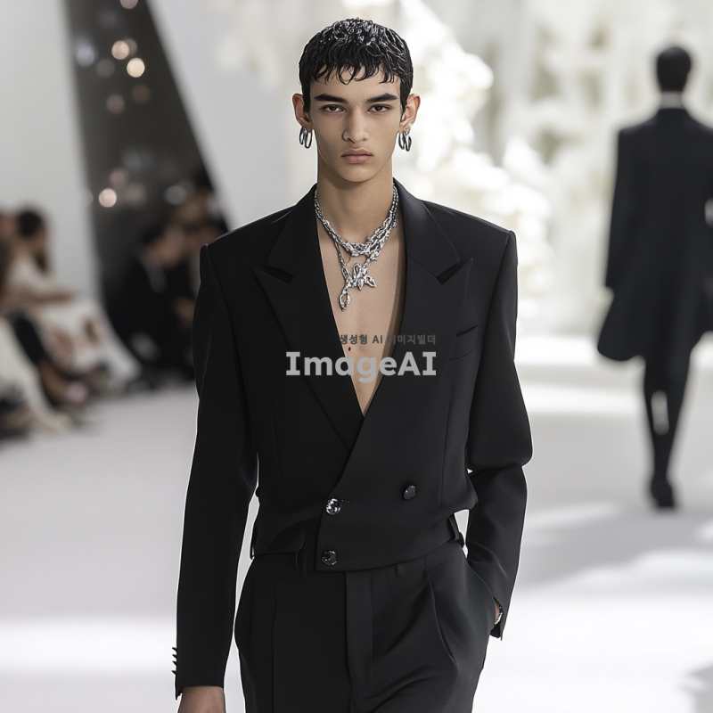 남성 모델이 현대적인 디자인의 검은색 정장과 바지를 입고 런웨이를 걷고 있다. 실버 귀걸이와 목걸이를 매치했다. 배경은 미니멀리스트 스타일의 디자인 요소가 가미된 흰색이다. 디올의 고급 패션쇼는 고화질 사진을 특징으로 한다.
