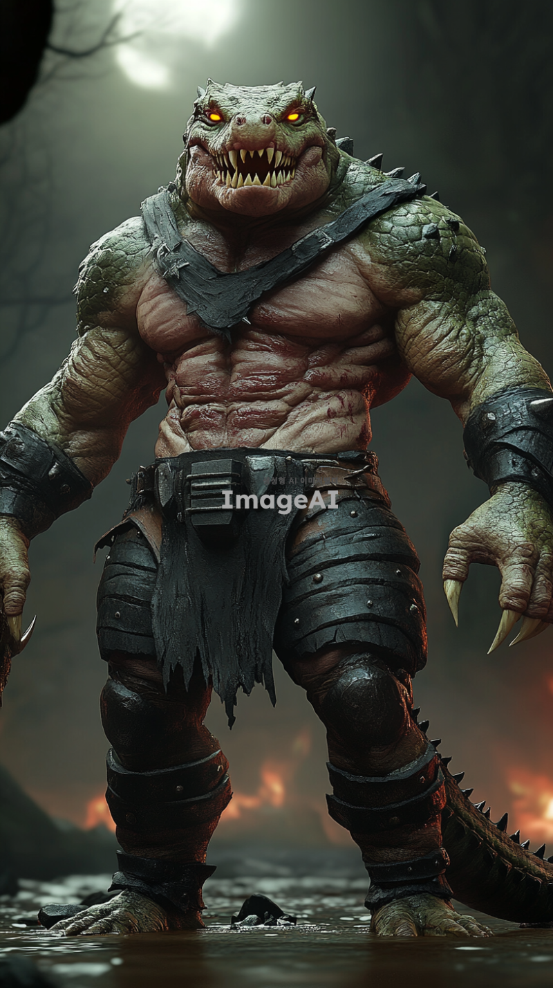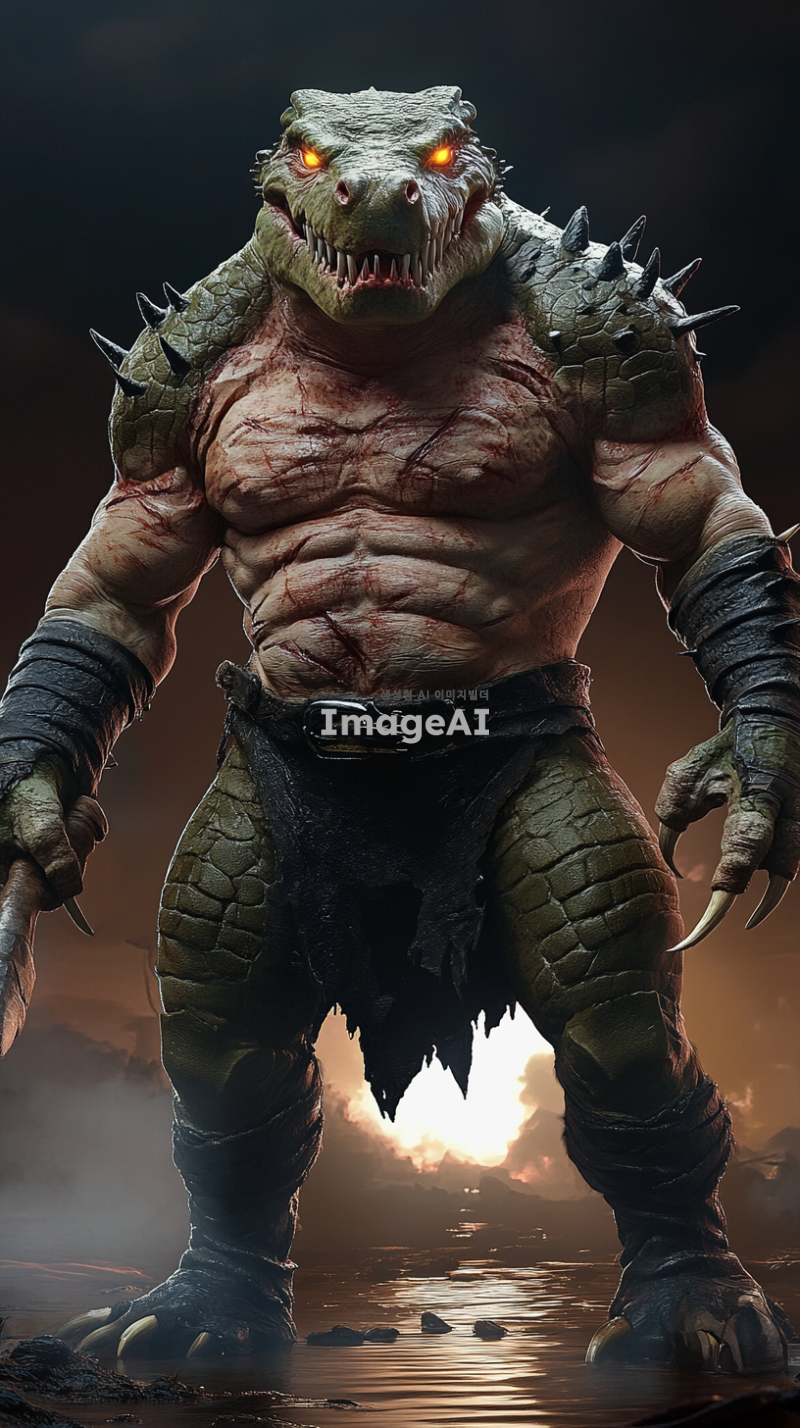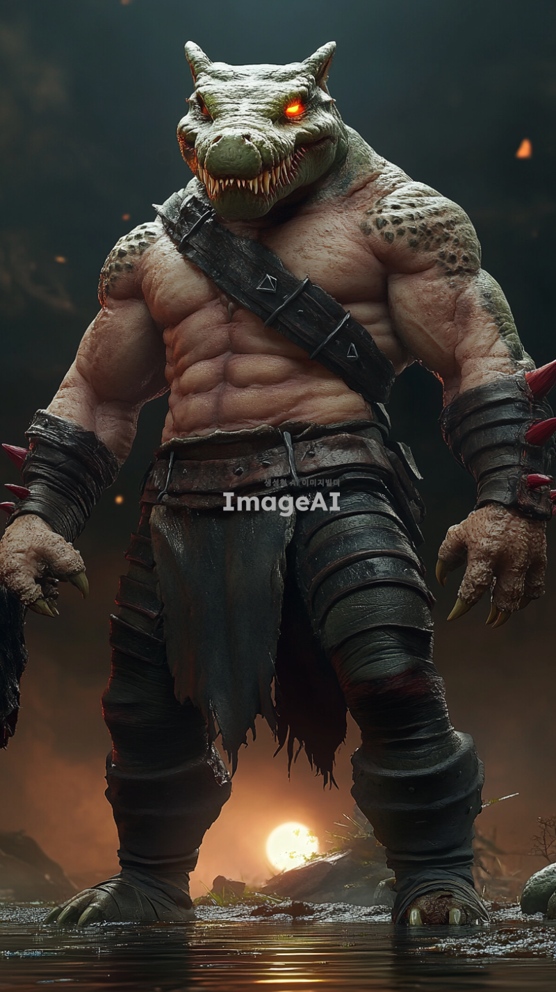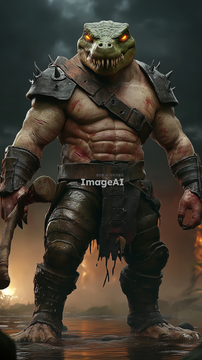 캐릭터는 어두운 늪지대에 서 있으며, 고인 물에서 올라오는 안개와 희미한 달빛이 물 표면에 섬뜩한 반사를 만들어냅니다. 이 분위기는 그들의 은밀함, 회복력, 그리고 두려움을 유발하는 존재감을 강조합니다. 전체적인 디자인은 포식자로서의 본성과 적응력, 그리고 고대적인 강인함을 드러내며, 동시에 공포와 경외감을 불러일으키는 캐릭터를 창조합니다.
