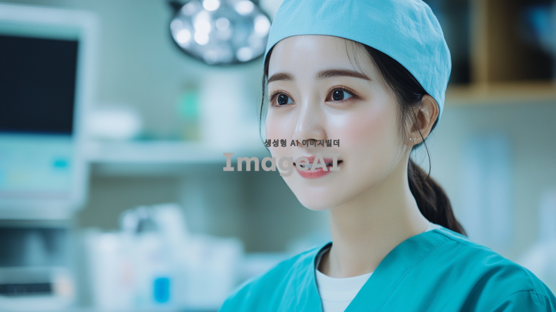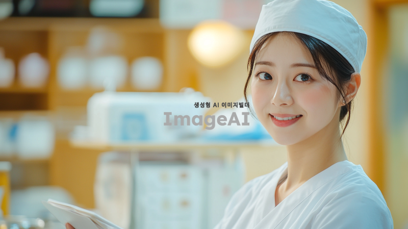 간호모자를 쓰고 단상에서 교육을 진행하고 있는 한국인 간호사의 모습. 밝고 단정한 분위기로, 청중을 향해 설명하는 모습이 담긴 이미지. 주변에는 교육 자료와 간호 관련 도구들이 배치되어 있으며, 따뜻한 조명이 비추는 공간. 간호사의 표정은 친절하고 자신감 넘치며, 전문적인 느낌을 주는 의상과 함께.