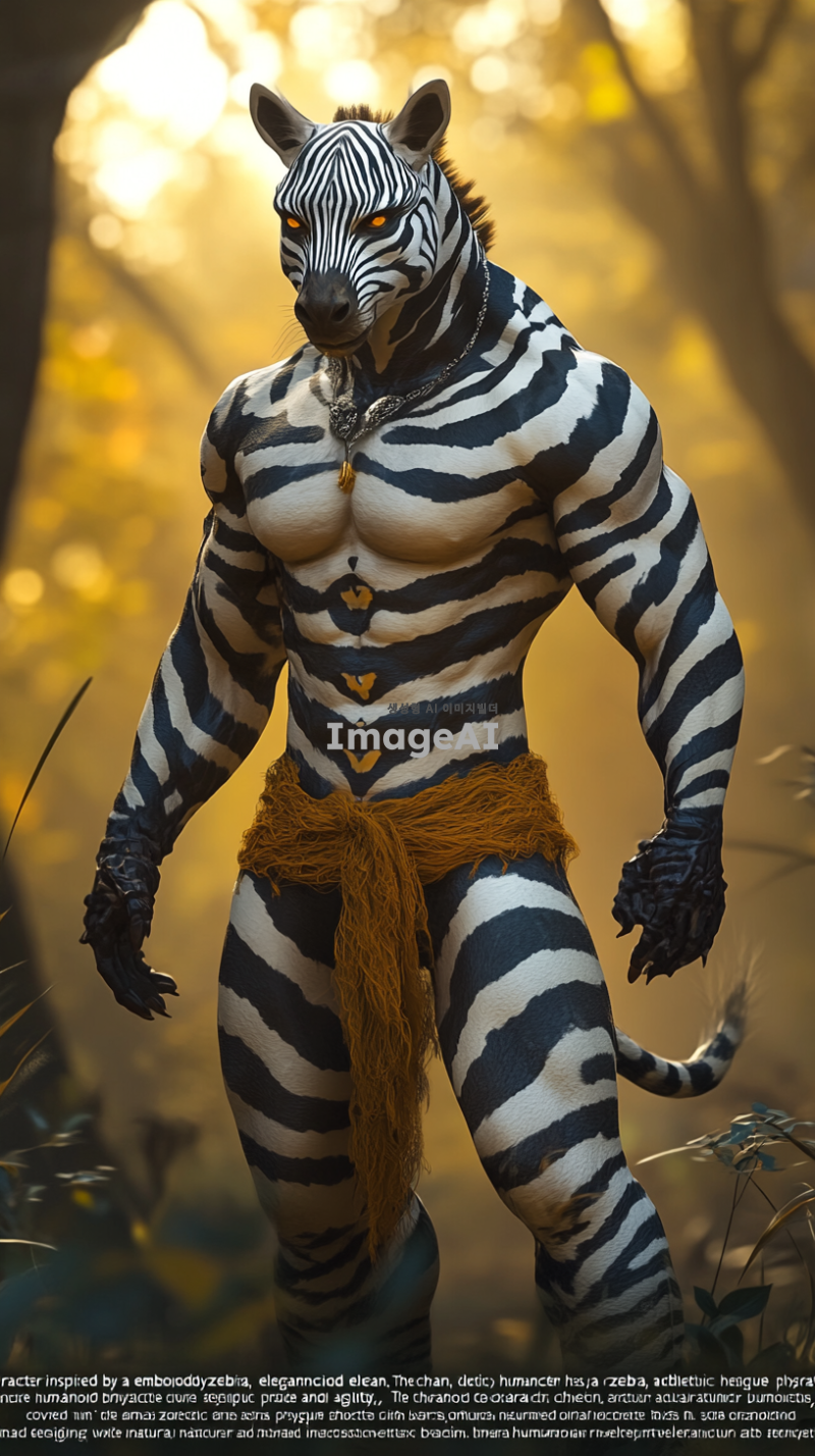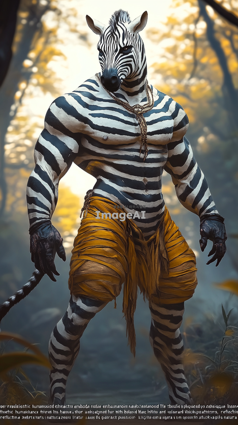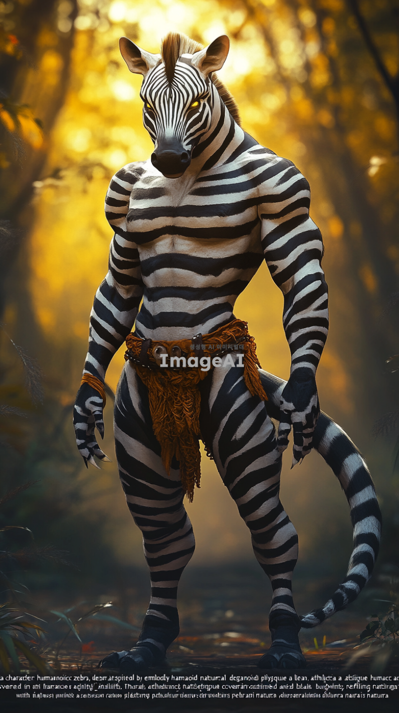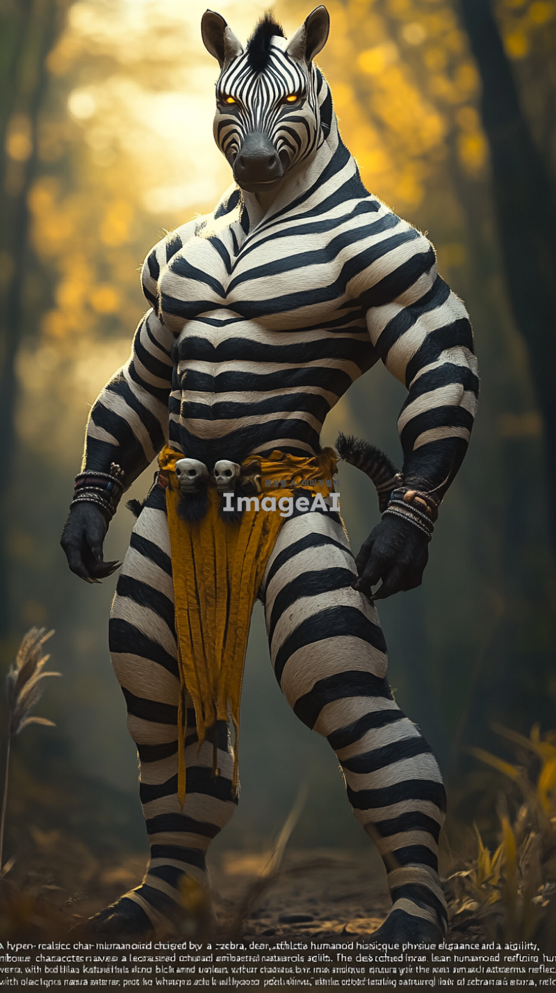 "A hyper-realistic humanoid character inspired by a zebra, designed to embody natural elegance and agility. The character has a lean, athletic humanoid physique covered in short, striped fur with bold black and white patterns, reflecting a zebra’s natural coat. Their face blends human and zebra traits, featuring a strong jawline, a slightly elongated nose, and expressive eyes radiating focus and determination. Upright ears add to their alert and composed appearance.