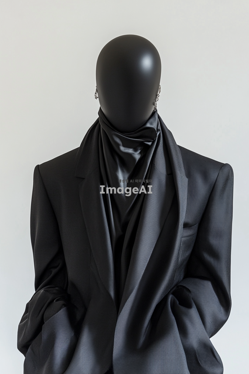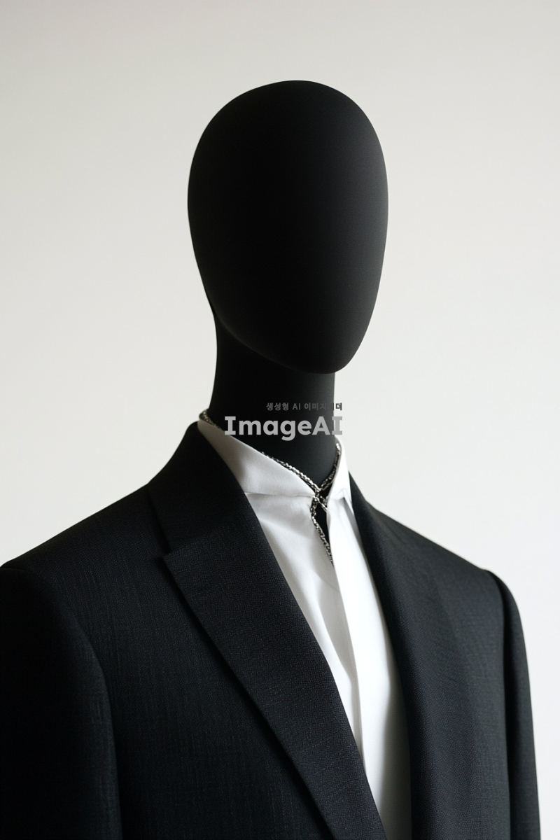 깔끔한 화이트 배경에 마네킹에 걸쳐진 도시적인 디올 디자인의 블랙 수트 자켓을 중심으로 한 사진. 수트 자켓은 세련된 라인과 현대적인 감각을 강조하며, 실버 쥬얼리가 조화롭게 매치되어 있어 패션쇼를 위한 참고용 의상으로 적합한 느낌을 줌.
