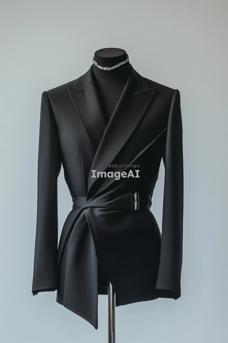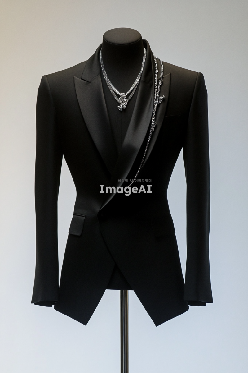 인물이 없는 착장 사진, 패션쇼를 위한 참고용 의상 사진, 배경은 깔끔한 화이트, 마네킹에 걸쳐진 도시적인 디올 디자인 무드의 깔끔한 블랙 수트 자켓, 실버 쥬얼리 매치업.