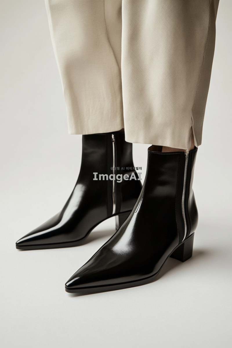 생로랑 스타일의 첼시 부츠, 미니멀하고 현대적이며 시크한 디자인, 날렵한 형태, 뾰족한 앞코, 미니멀한 실버 포인트, 배경은 밝은 색의 바닥으로 제품이 잘 보이도록 구성된 패션쇼 참고용 착장 사진.
