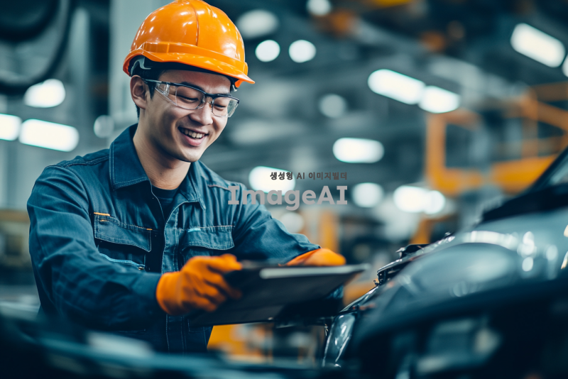 현대자동차 생산공장에서 일하는 한국인 직원들이 자부심을 느끼며 협력하고 있는 모습, 현대적인 공장 내부 배경, 정교한 자동차 조립 라인, 직원들이 서로 소통하며 작업하는 장면, 밝고 긍정적인 분위기, 각자의 역할에 최선을 다하는 모습, 현대적인 작업복과 안전 장비 착용, 팀워크와 전문성을 강조하는 이미지