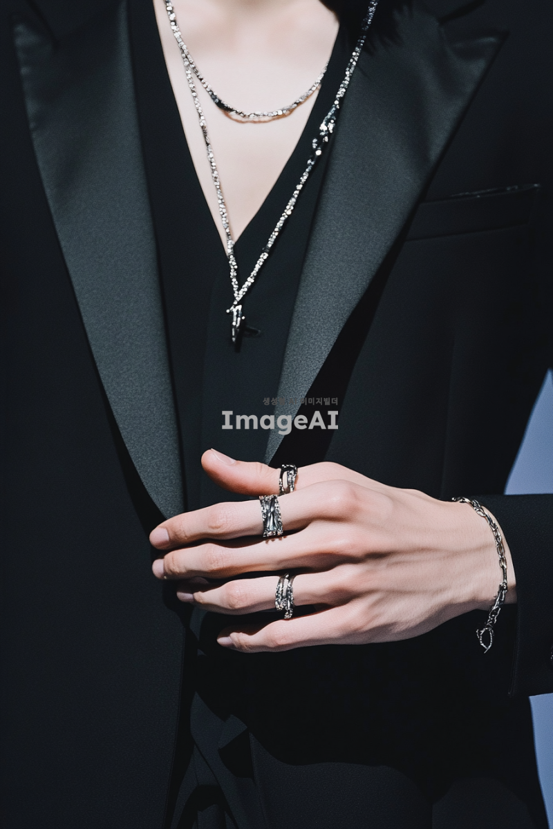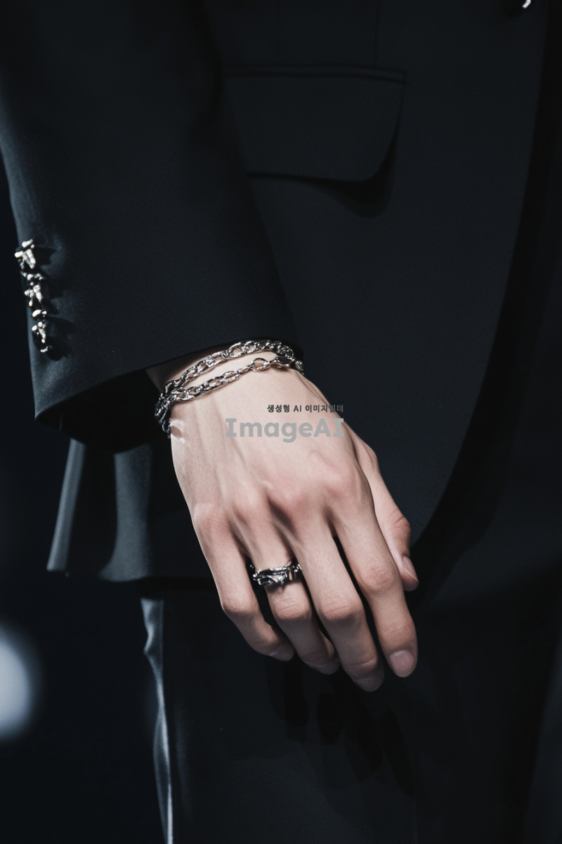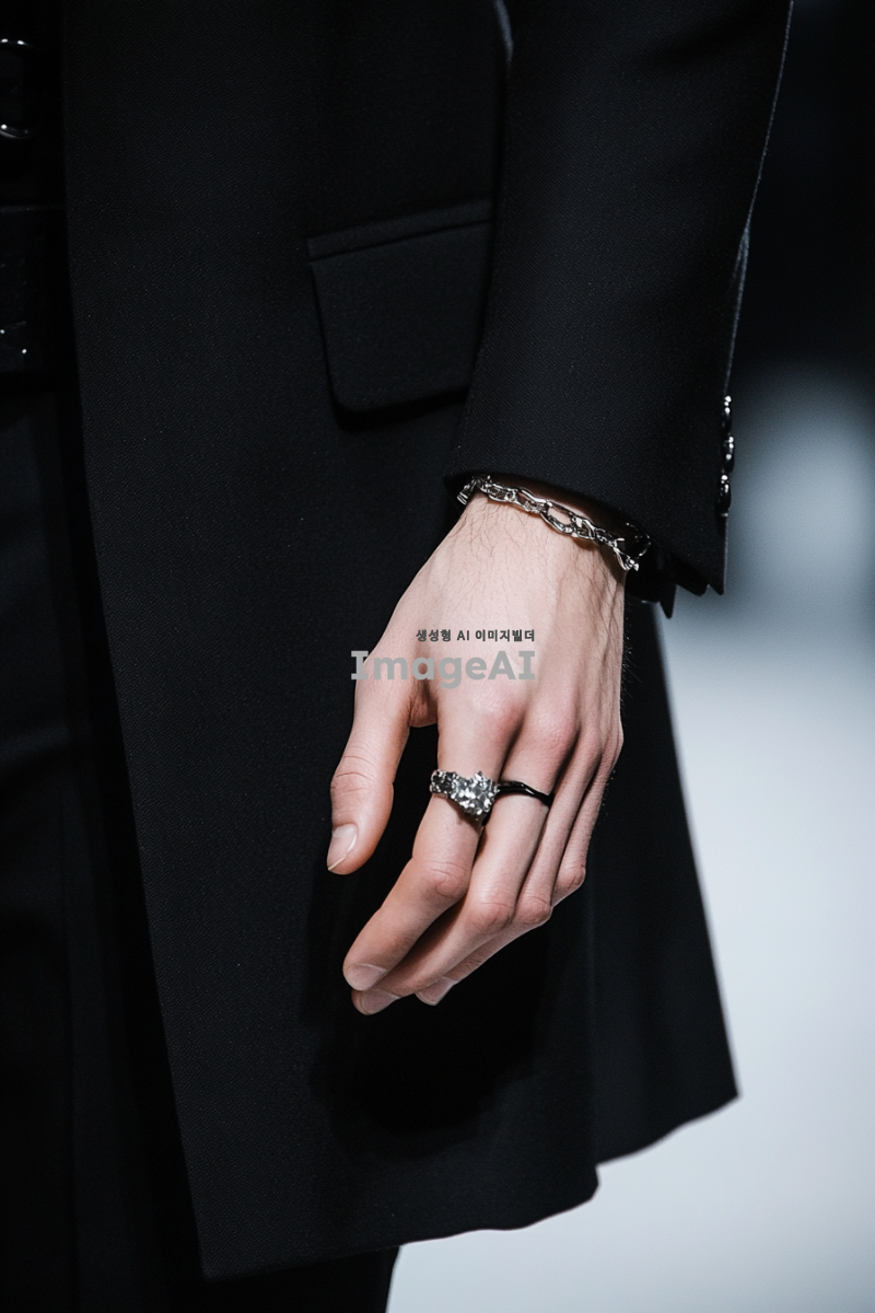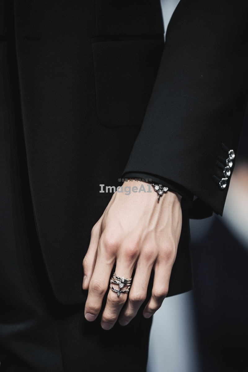 시크한 블랙 수트를 입고 실버 주얼리를 착용한 한국 남성의 손 클로즈업 사진. 손가락은 얇고 하얗고 길게 뻗어 있으며, 손의 모양은 너무 투박하지 않게 자연스럽고 우아하게 표현. 배경은 심플하고 세련된 느낌으로, 패션쇼의 분위기를 강조.