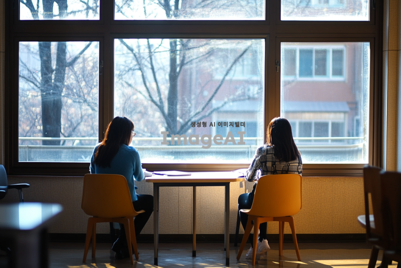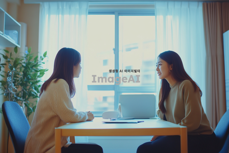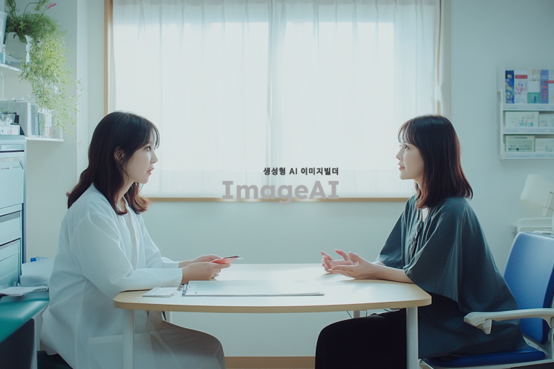 병원 상담실을 배경으로 테이블을 사이에 두고 한국인 여자 상담실장과 한국인 여자 환자가 상담하는 모습 밝고 편안한 분위기