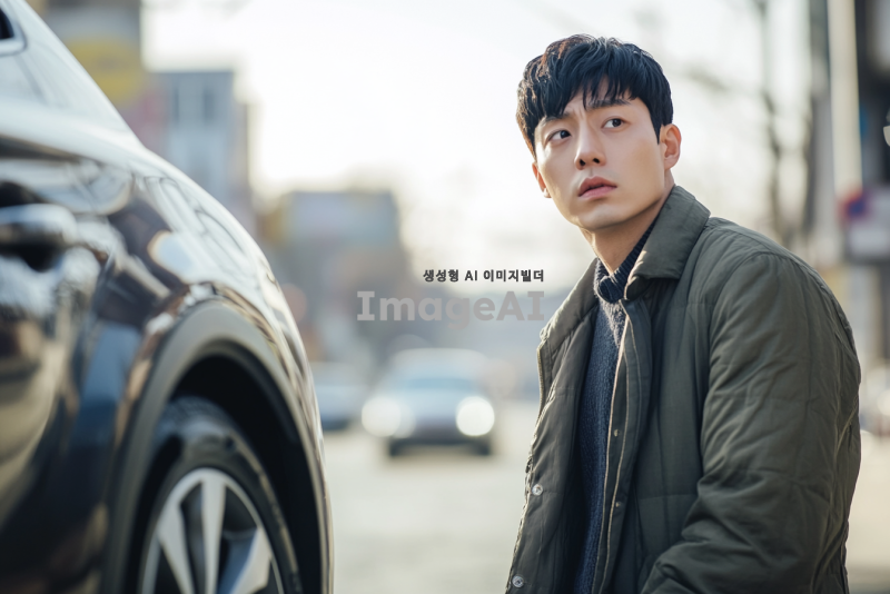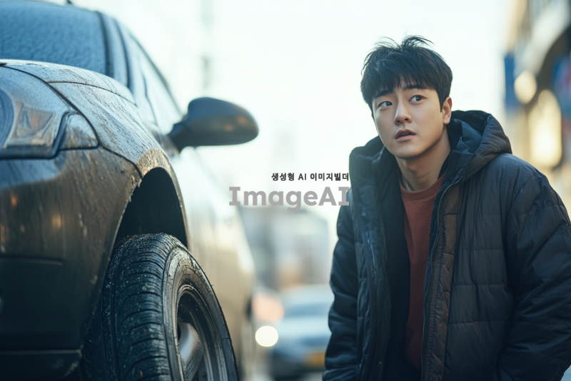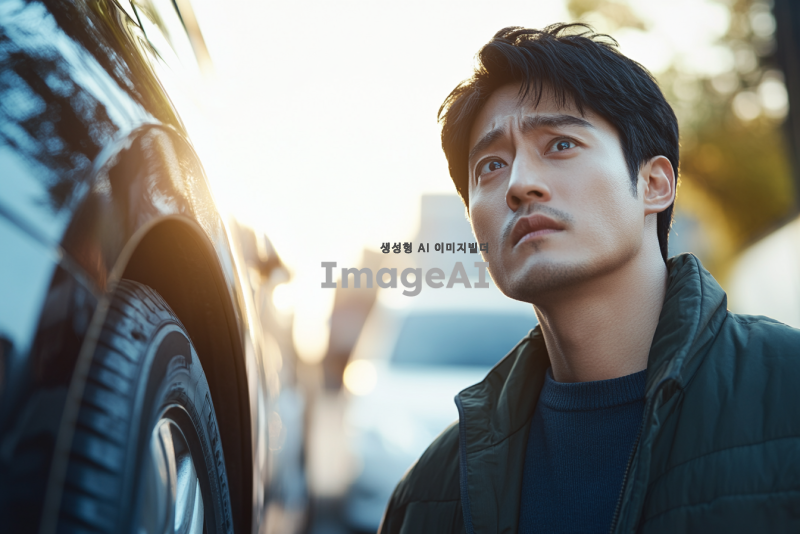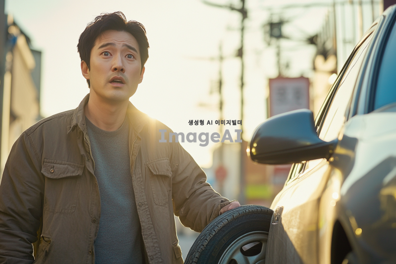 자동차의 앞부분 왼쪽 타이어가 공기압이 빠져 있는 모습, 옆에서 난감한 표정을 짓고 있는 한국인 남성, 차량의 배경은 도시 거리, 날씨는 맑고 햇살이 비치는 오후, 남성은 캐주얼한 의상을 입고 있음.