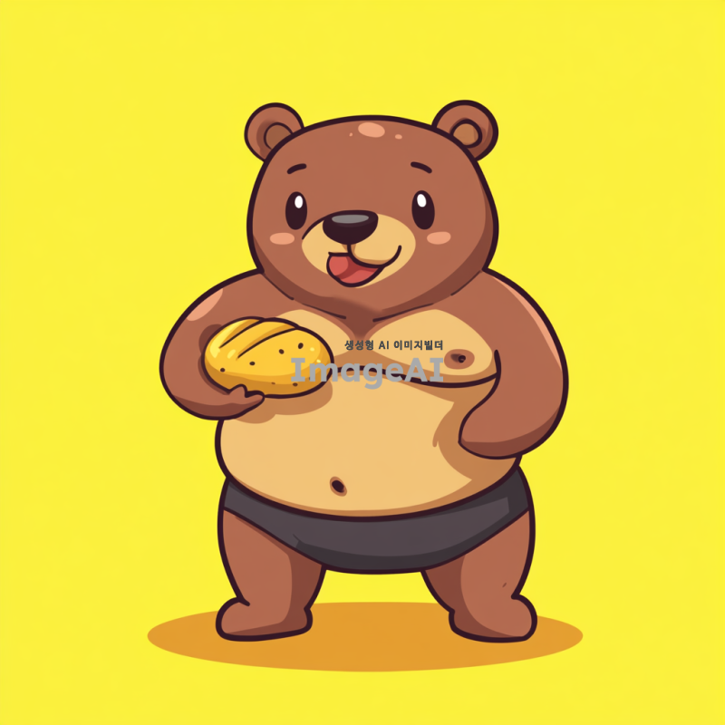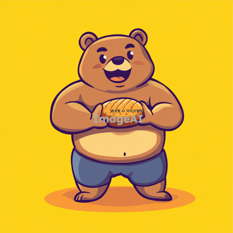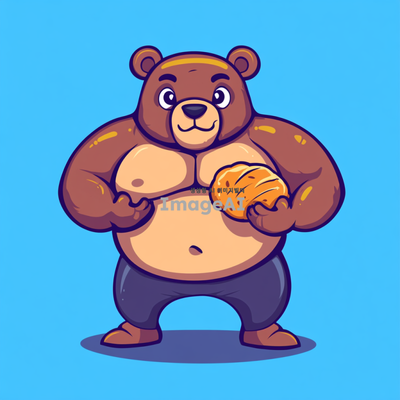 헬스하는 곰, 몸매가 좋은 피지크 스타일, 식스팩이 뚜렷한 근육맨 모습, 단순한 캐릭터 디자인, 빵을 먹고 있는 모습, 울룩불룩한 배, 귀여운 표정, 밝고 경쾌한 색감, 만화 스타일.