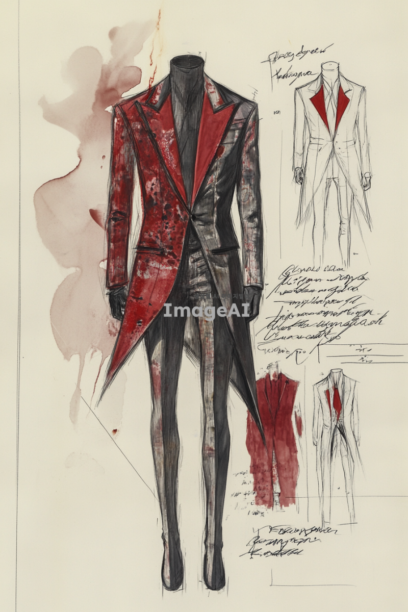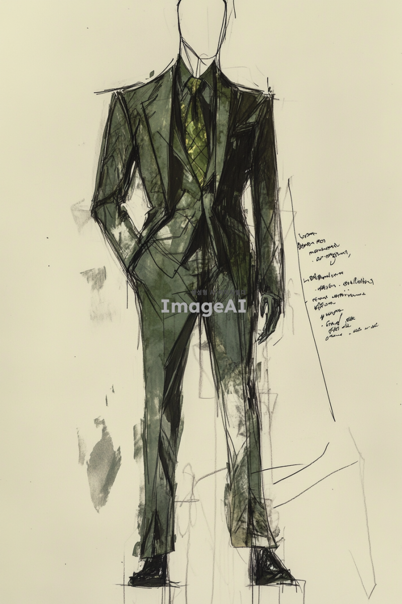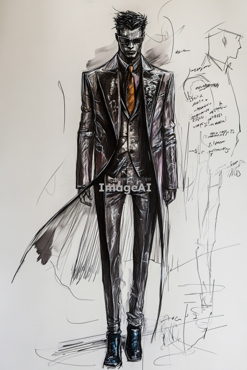 매트릭스 스타일의 남성 수트 디자인 스케치, 도시적이고 현대적인 무드의 패션쇼 의상을 표현한 러프한 느낌의 스케치. 약간의 채색이 더해져 있으며, 스케치 옆에는 디자이너의 코멘트가 적혀 있다.