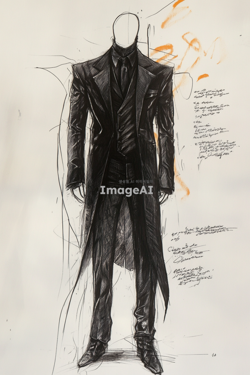 패션쇼를 위한 의상 디자인 스케치, 매트릭스 스타일의 남성 수트 디자인, 도시적이고 현대적인 무드의 패션쇼 의상, 러프하게 그린 스케치에 약간의 채색. 패션 디자인 스케치 옆에는 디자이너가 적어놓은 코멘트가 있다.
