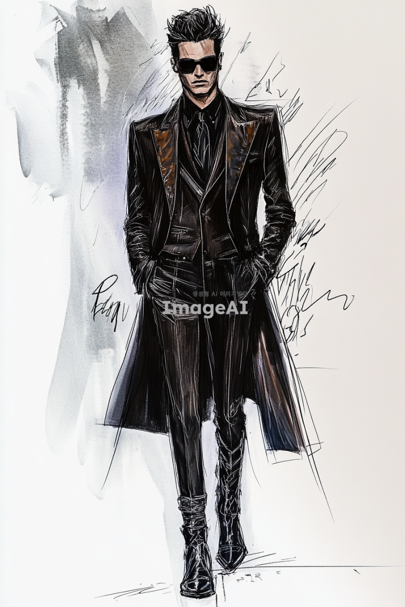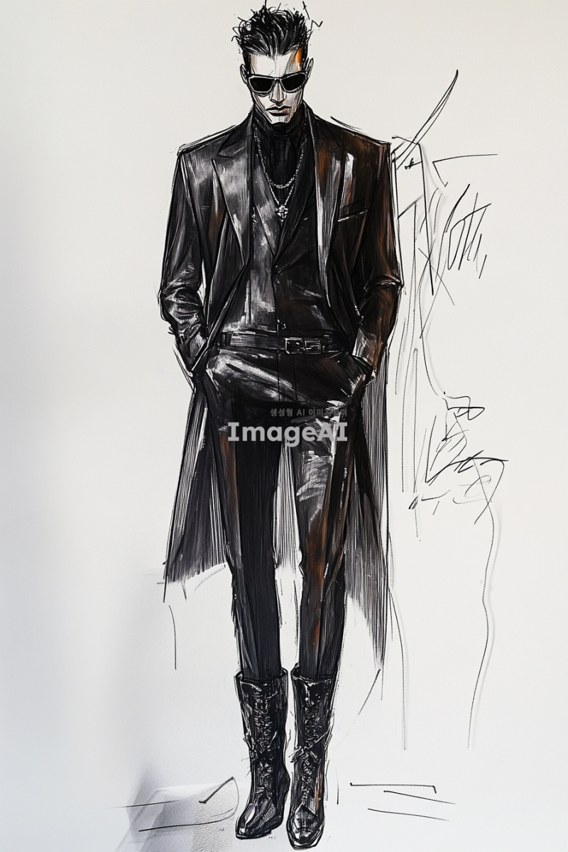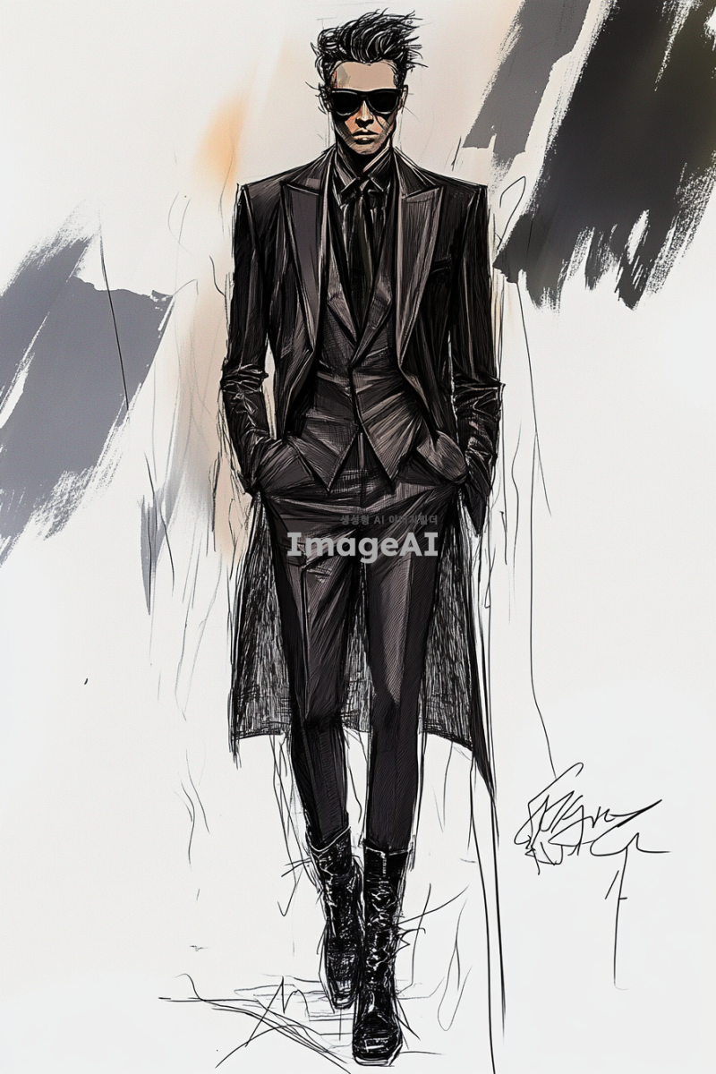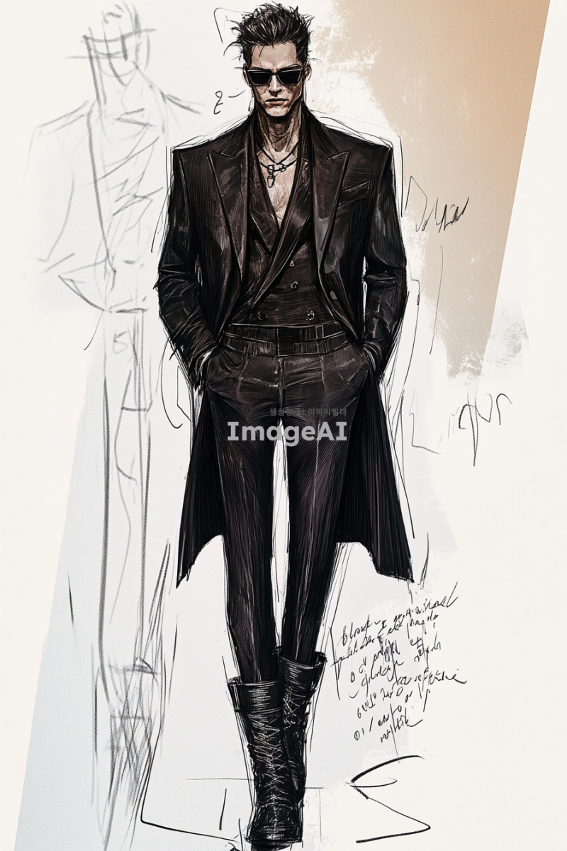 패션쇼를 위한 전신 디자인 스케치. 도시적이고 현대적인 느낌의 남성 블랙 수트 디자인 스케치. 자켓 안에는 이너를 입고 있지 않음. 무릎까지 올라오는 긴 부츠 디자인. 디올 무드를 참고하여 세련되면서도 남성적인 요소를 강조. 어려보이는 디자인 스케치. 트랜디한 선글라스를 착용한 모습. 러프한 디자인 스케치에 약간의 채색을 추가하여 생동감을 부여. 그림 옆에는 디자이너의 코멘트가 적혀 있어 디자인 의도를 설명하고 있음.