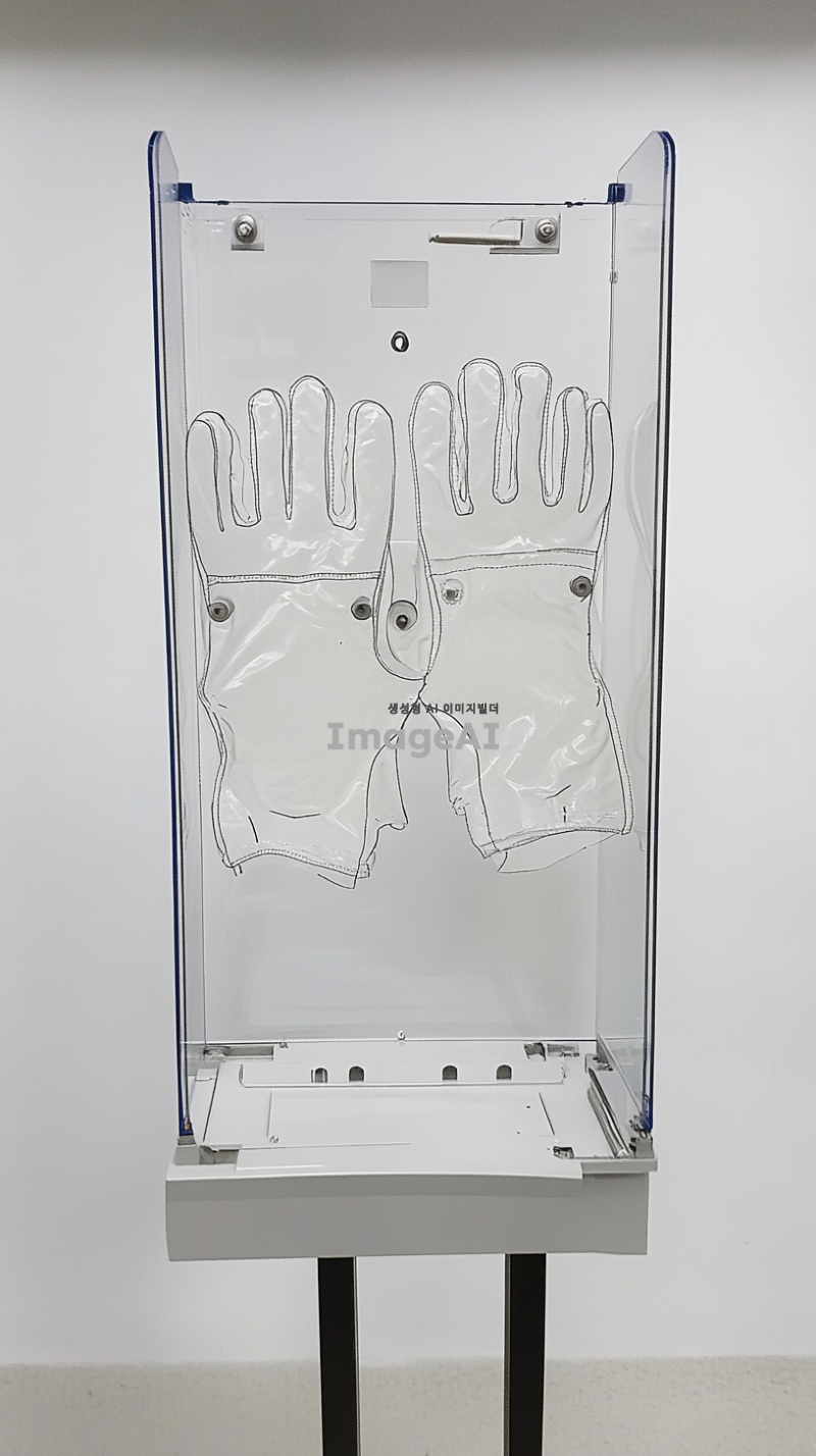 하부에 높낮이 조절이 가능한 지지대가 달린 유리방패, 유리 방패 중앙에 양 손을 넣을수있는 구멍이 있고 그 구멍에 고압 전기 작업용 절연 장갑이 부착되어 있음, 구멍에 손 넣으면 바로 장갑이 착용가능함