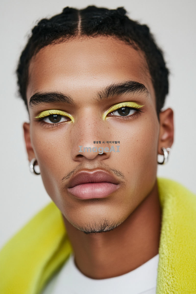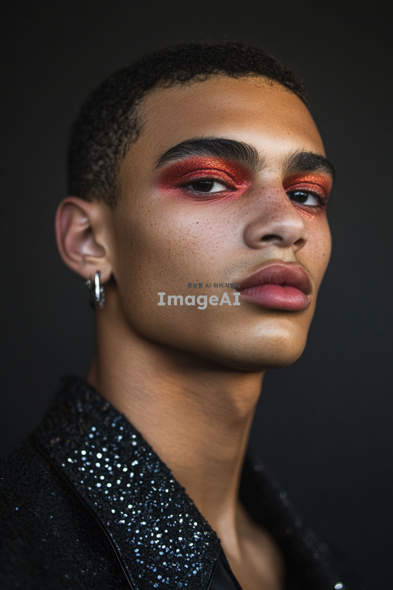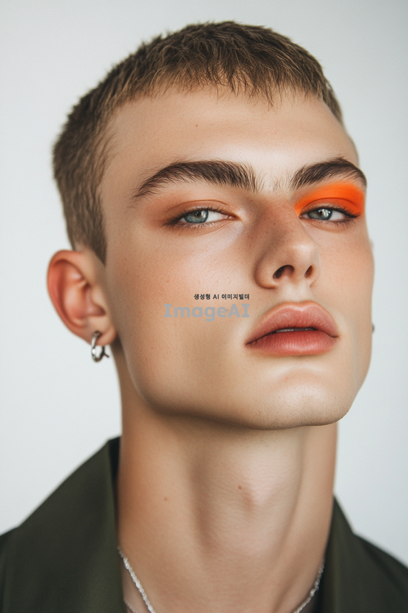 패션쇼 남성 모델 메이크업 참고용 클로즈업 사진. 시크한 무드의 짙은 아이메이크업 사진. 어려보이는 얼굴의 트랜디한 남성 모델. 미니멀한 실버 귀걸이 착용. 정면 사진.