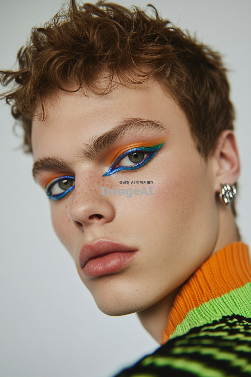 시크한 무드의 짙은 아이메이크업을 한 어려보이는 얼굴의 트랜디한 남성 모델의 정면 클로즈업 사진. 미니멀한 실버 귀걸이를 착용하고 있으며, 패션쇼와 관련된 스타일을 강조한 이미지.