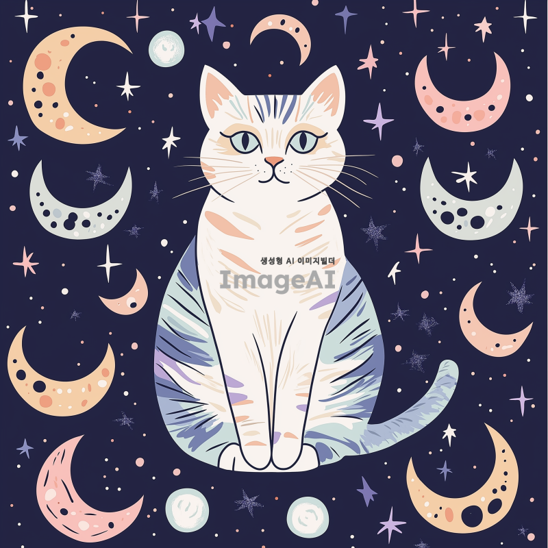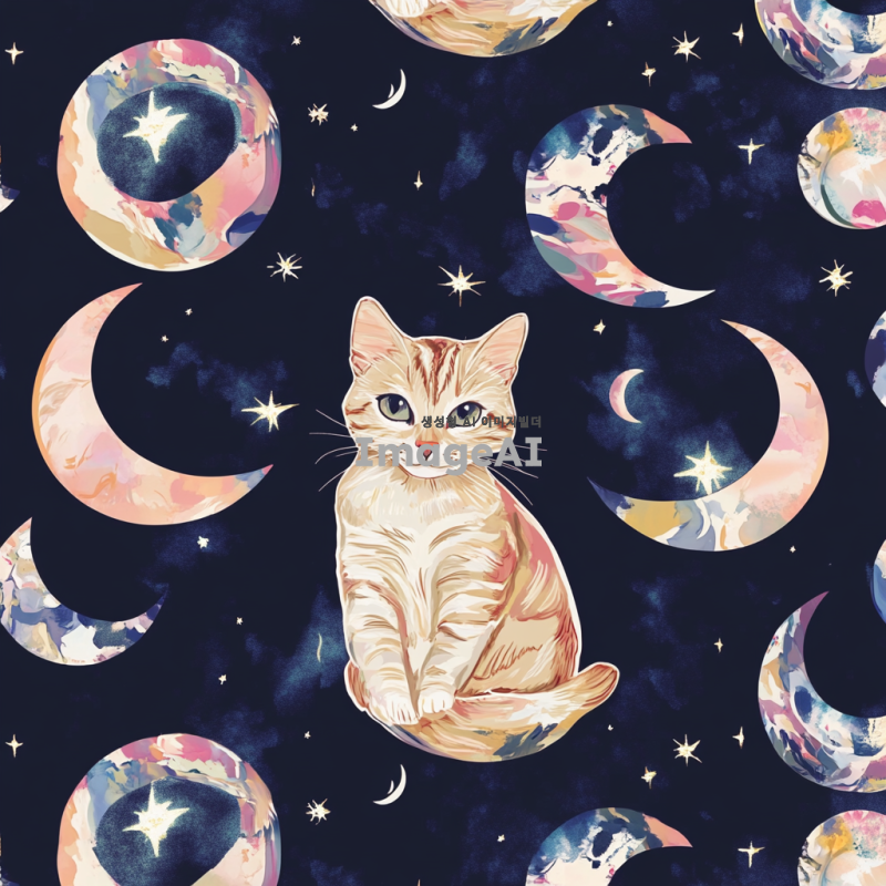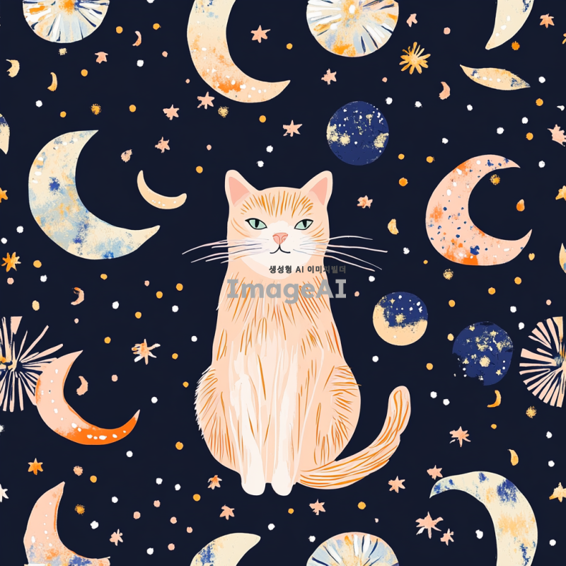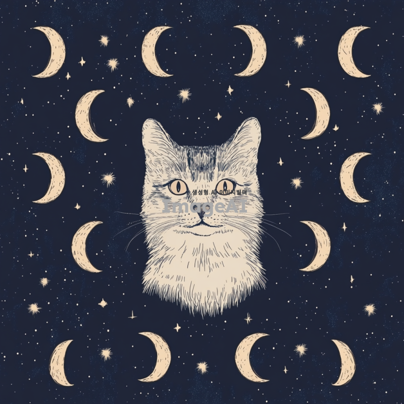 네이비색 배경에 고양이가 있는 이미지, 고양이 주변에 달 패턴이 흩어져 있는 모습, 고양이는 귀엽고 장난스러운 표정을 짓고 있으며, 달은 반달과 보름달 형태로 다양하게 배치되어 있음. 고양이의 털은 부드럽고 윤기나는 색상으로 표현되고, 배경의 네이비색은 깊고 풍부하게 나타나도록.