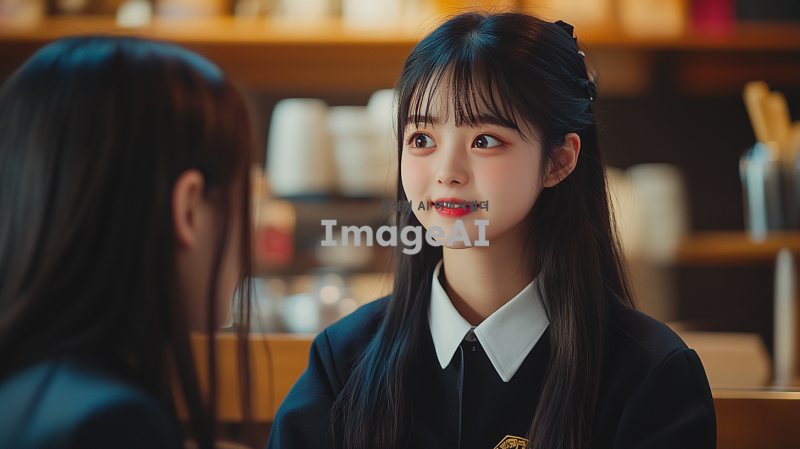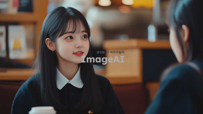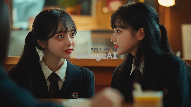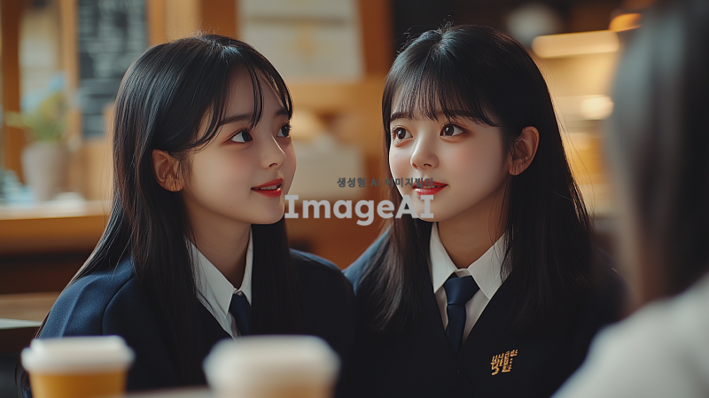 카페에서 한국 교복을 입은 검은 머리의 한국 여고생 두 명이 낮에 서로를 바라보고 있는 장면. 한 명은 미소를 지으며 행복한 표정을 짓고 있고, 다른 한 명은 따뜻한 시선으로 바라보고 있다. 주변에는 아늑한 카페 분위기가 느껴지며, 자연광이 부드럽게 들어오는 모습.