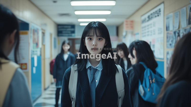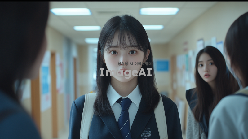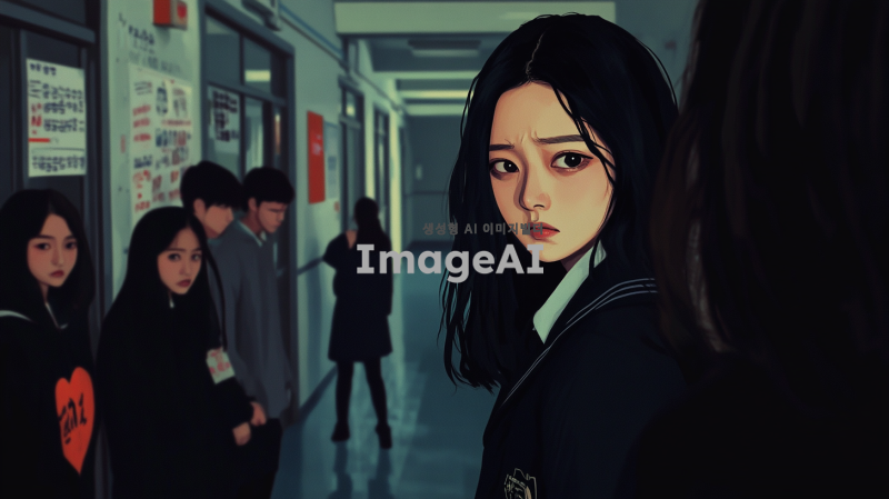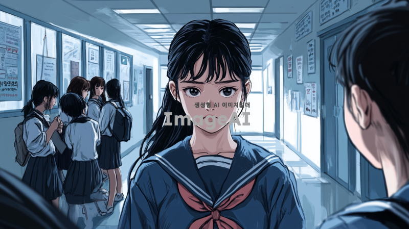 학교 복도에서 한국 교복을 입은 검은 머리의 한국 여고생이 어두운 표정으로 지나가고 있다. 그녀의 주위에는 친구들이 모여서 그녀를 보며 수군거리고 있다. 복도는 학교의 전형적인 모습으로, 벽에는 포스터와 공지사항이 붙어 있고, 바닥은 깨끗한 타일로 되어 있다. 여고생의 표정은 슬프고 고민에 빠진 듯하며, 친구들은 호기심 어린 시선으로 그녀를 바라보고 있다.