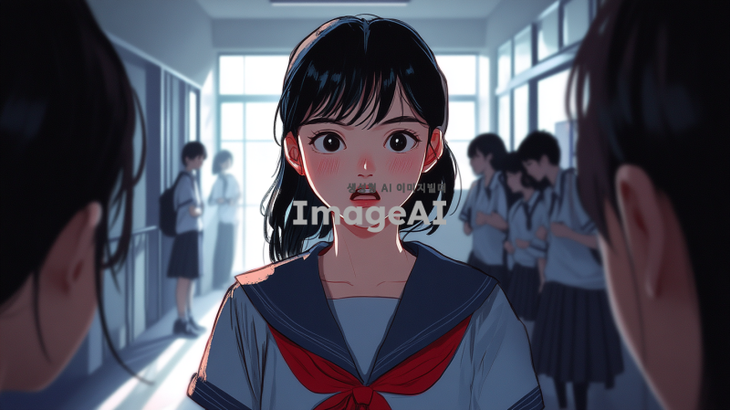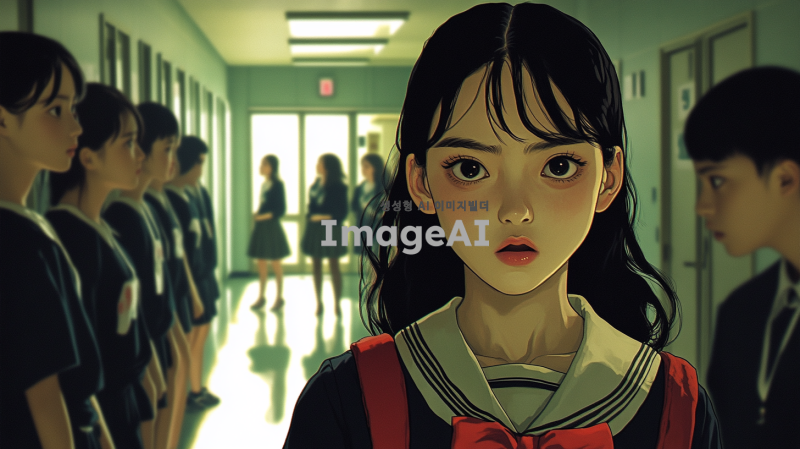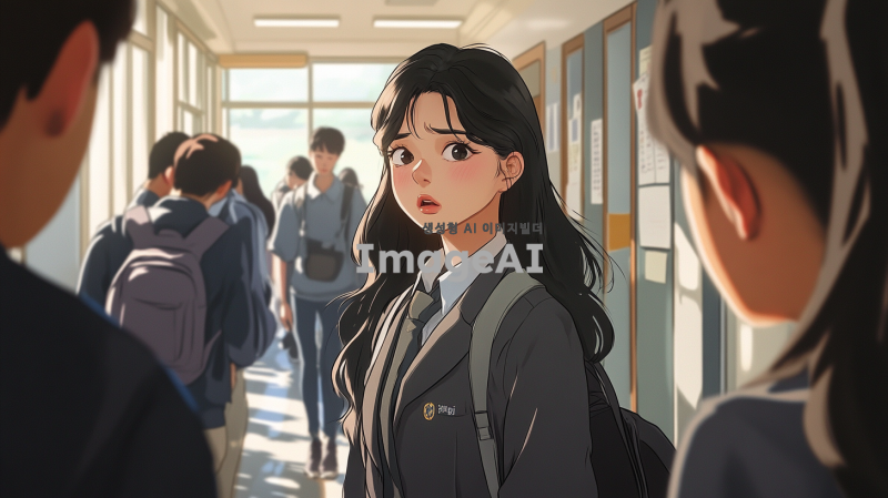한국 학교 복도, 한국 교복을 입은 검은 머리의 한국 여고생이 당황하고 혼란스러운 표정으로 두려움에 떨고 있는 모습. 주위의 학생들이 그녀를 바라보며 수군거리고 있는 장면. 복도는 밝고, 주변에는 교실과 띄엄띄엄 서 있는 학생들이 보인다. 분위기는 긴장감이 감돌고, 여고생의 표정과 자세에 초점을 맞춘다.