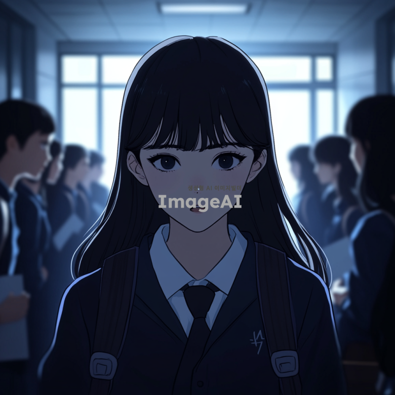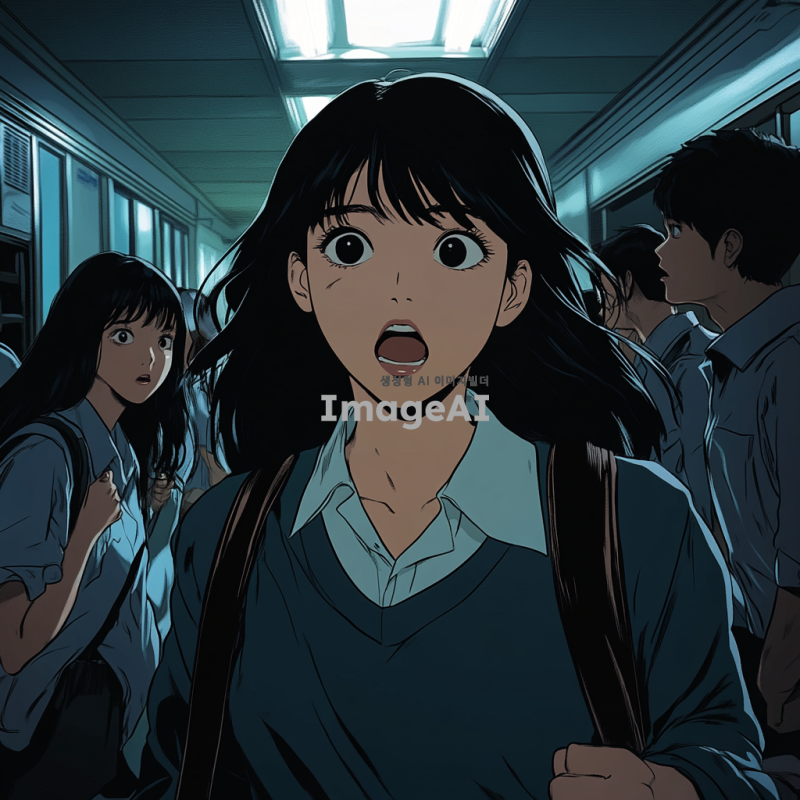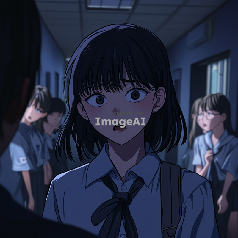 학교 복도에서 한국 교복을 입은 검은 머리의 한국 여고생이 어두운 표정으로 두려움에 떨며 지나가고 있다. 그녀의 주변에는 친구들이 모여서 그녀를 쳐다보며 수군거리고 있는 모습이 담겨 있다. 복도는 학교의 전형적인 분위기를 가지고 있으며, 조명은 약간 어둡고 긴장감이 느껴지는 장면이다.